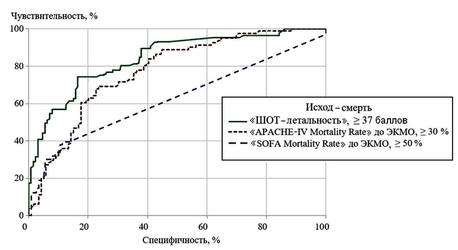 ROC-кривые «ШОТ–летальность», «SOFA Mortality Rate» и «APACHE-IV Mortality Rate» для показателя исход–смерть.