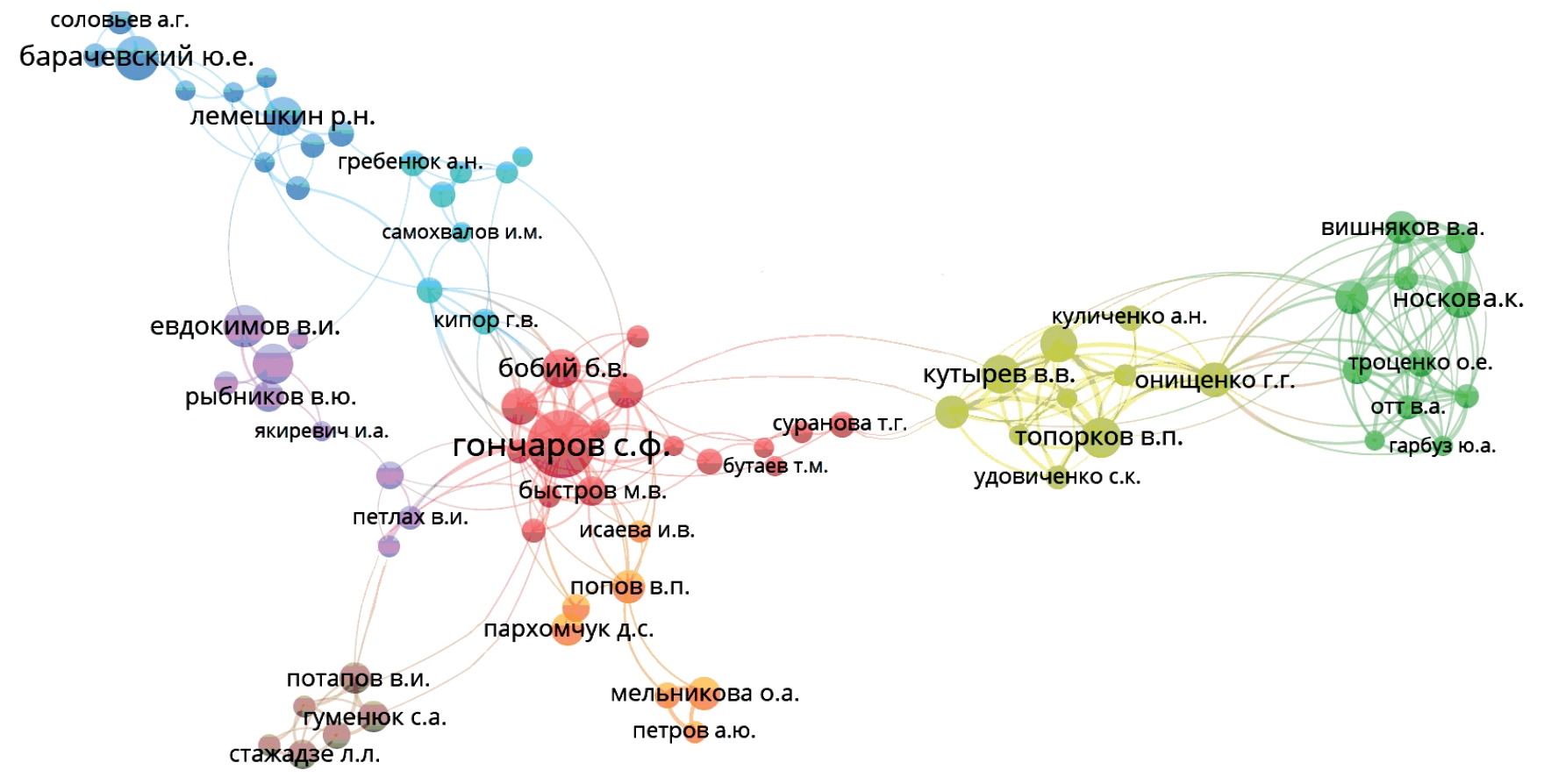 На рис. 3 представлено распределение публикаций во взаимосвязи с отечественными исследователями, подготовившими наибольшее количество научных публикаций по медико-биологическим и психологическим проблемам ЧС за период 2005–2021 гг. Ведущими «кластерами», с которыми взаимодействуют большинство других исследователей, являются научные школы по изучению безопасности в ЧС: