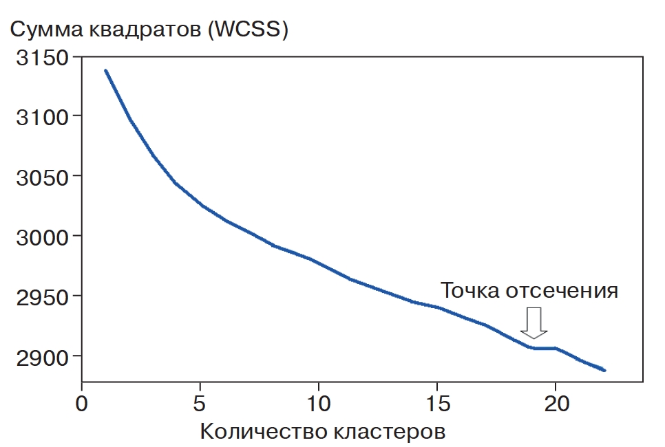 Было принято также решение провести кластерный анализ, основная задача которого заключается в автоматическом распределении научных статей на группы или кластеры, при этом заранее количество кластеров не задавалось. Применено так называемое машинное обучение без учителя. Один из ключевых вопросов, который предстояло решить на этапе обучения модели, заключался в выборе оптимального количества кластеров. Количество кластеров в данной методике является гиперпараметром, т.е. тем параметром, который следовало указать до обучения модели. Для определения оптимального количества кластеров был использован метод локтя (англ. Elbow method) – графический метод определения оптимального количества кластеров основан на зависимости суммы квадратов расстояний между объектами и центрами кластеров от их количества. В процессе применения данного метода строится график зависимости суммы квадратов расстояний от количества кластеров, на котором определяется точка, где кривая «сгибается» (визуально напоминает локоть). Сумма квадратов внутрикластерных расстояний (Within cluster sum of squares, WСSS) – метрика для оценки качества кластеризации, которая измеряла, насколько сильно объекты внутри одного кластера похожи друг на друга. Она вычисляется путем суммирования квадратов расстояний каждого элемента кластера до центроида этого кластера. Чем меньше значение SSW, тем лучше кластеризация, т.е. объекты внутри каждого кластера находятся ближе друг к другу, чем к объектам из других кластеров. Из графика, представленного на рис. 4, следует, что при переходе от 19 до 20 кластеров ошибка произвела скачок вверх и в дальнейшем стала минимизироваться. Поэтому для обучения модели принято решение использовать 19 кластеров.