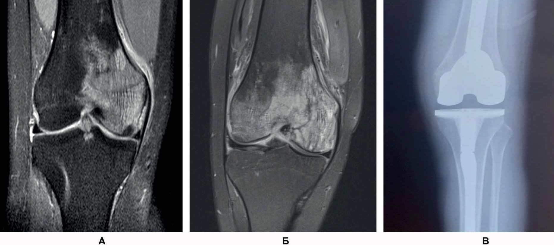 Рис. 1. СКТ левого коленного сустава у пациентки А. Диагноз: асептический некроз медиального мыщелка левой бедренной кости: 06.10.2021 г. (А), 25.11.2021 г. (Б), эндопротез левого коленного сустава (В).