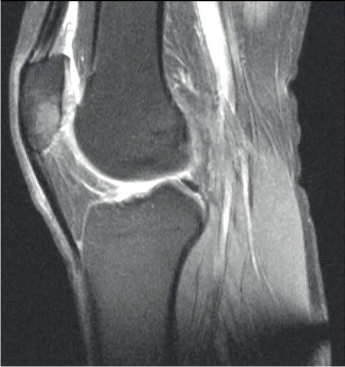 Рис. 2. МРТ коленного сустава у пациентки Б. Диагноз – асептический некроз нижнего полюса надколенника.