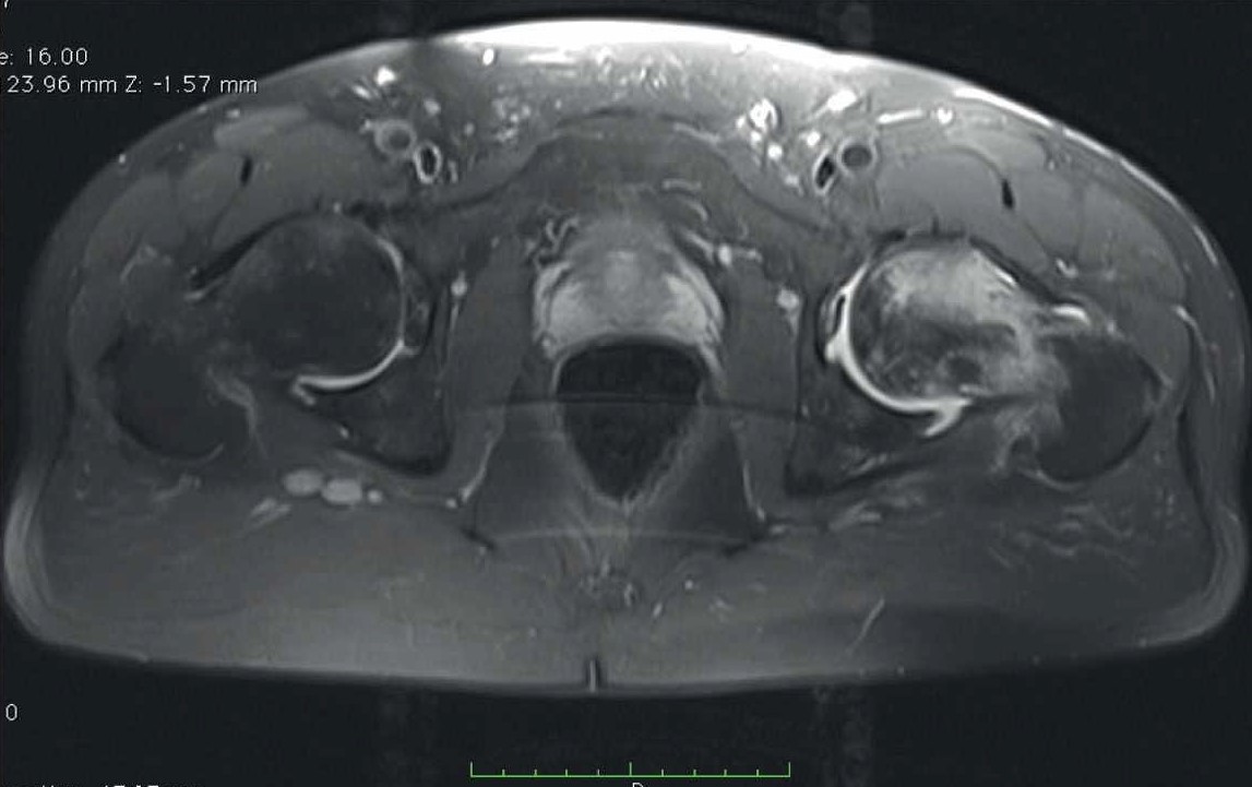 M. McKee и соавт. показали, что чувствительность к дозировке глюкокортикоидов у различных пациентов очень вариабельна: стероид-индуцированный остеонекроз головки бедренной кости клинически манифестировал после приема преднизолона в дозах от 290 до 3300 мг [16]. В нашем исследовании пациенты Б., В. и Г. получали дексаметазон в кумулятивной дозе в пересчете на преднизолон 720, 1813 и 3840 мг соответственно. С учетом приведенных данных литературы можно предположить – у пациентов развился стероид-индуцированный остеонекроз.