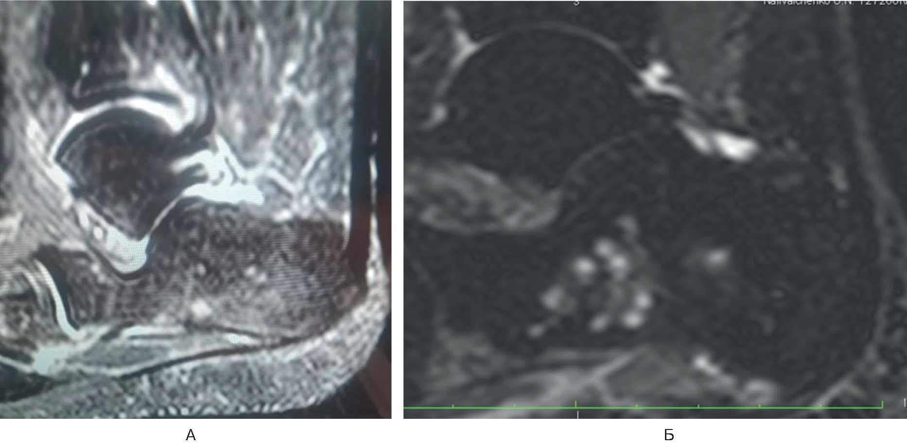 Лечилась у невролога консервативно с мая по сентябрь 2021 г. без положительной клинической динамики, а с сентября по декабрь 2021 г. – у травматолога по месту жительства по поводу тендопатии. Положительной клинической динамики не было. В марте 2022 г. на приеме у ортопеда выполнена МРТ правой стопы, диагноз – асептический некроз тела пяточной кости (рис. 4А).