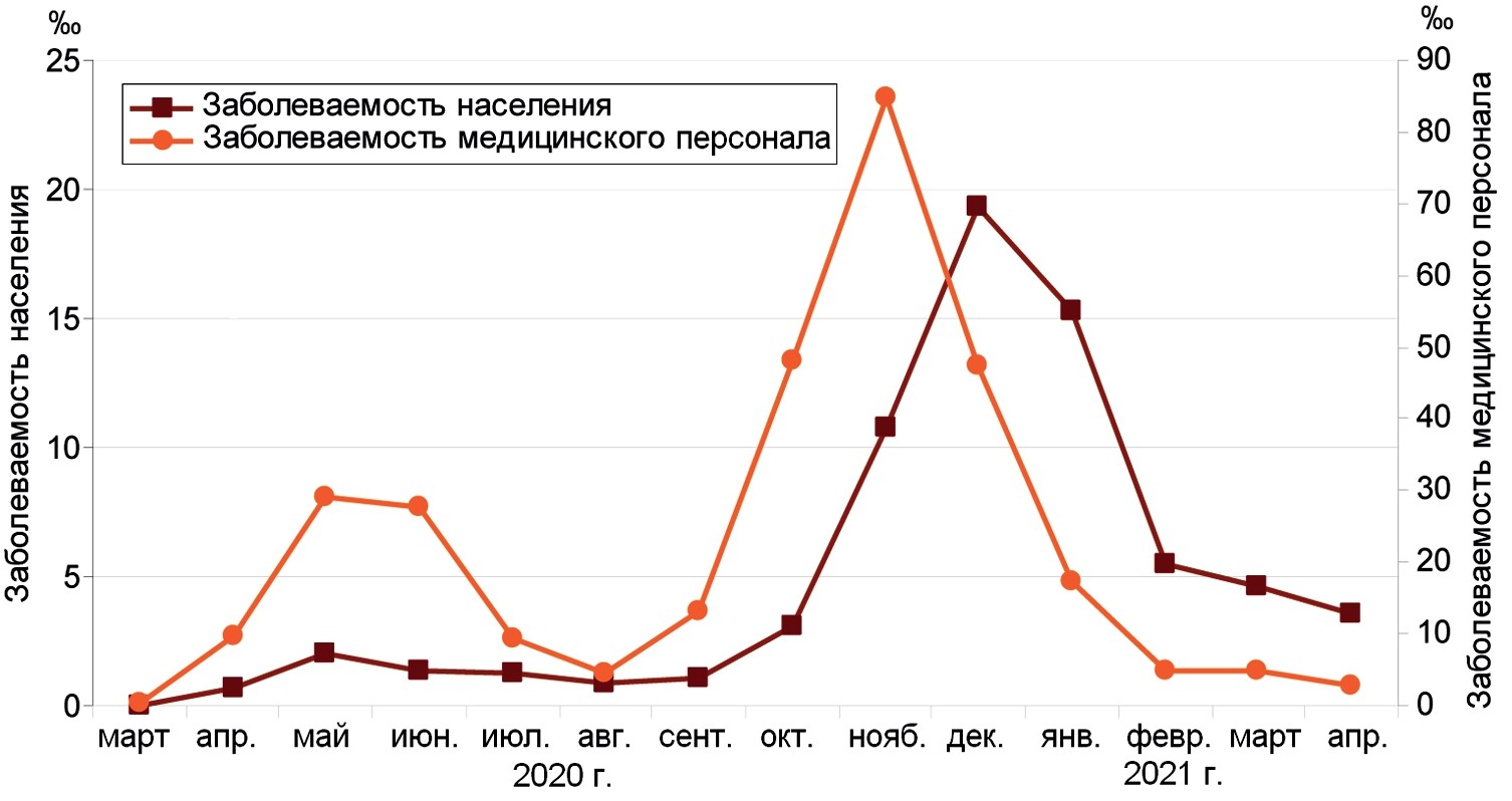 Сравнительный анализ заболеваемости медицинского персонала и населения Санкт-Петербурга в этот период свидетельствовал о значимом различии ее уровня между этими категориями (рис. 1).