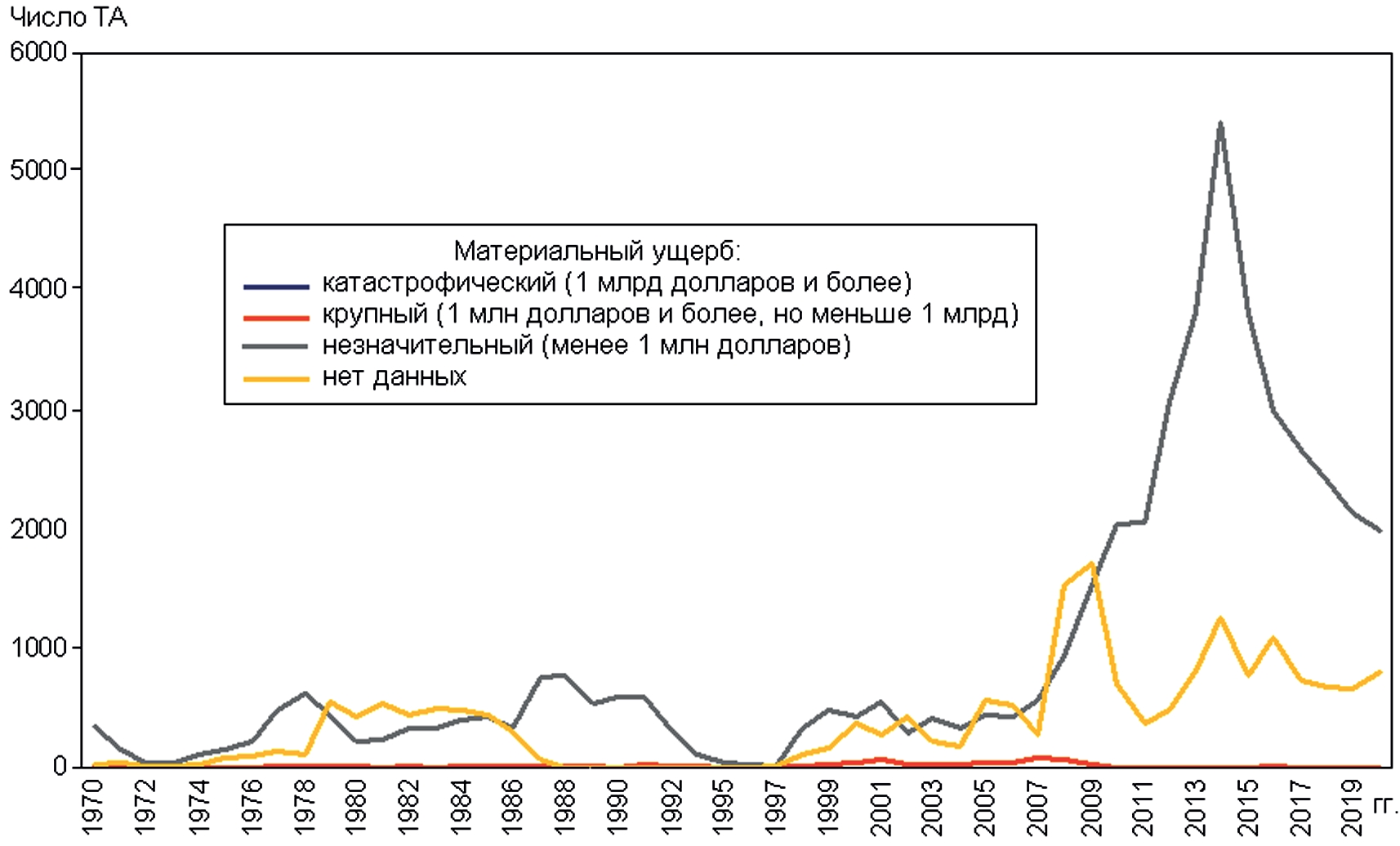 Из распределения по ущербу видно, что на долю катастрофических и крупных последствий ТА, сопровождавшихся гибелью людей, приходится менее 2 % от всех случаев. В большинстве случаев структура представлена последствиями до 1 млн долларов США – 70,3 %. При этом около 1/3 рассмотренной совокупности не имеет распределения из-за отсутствия данных.