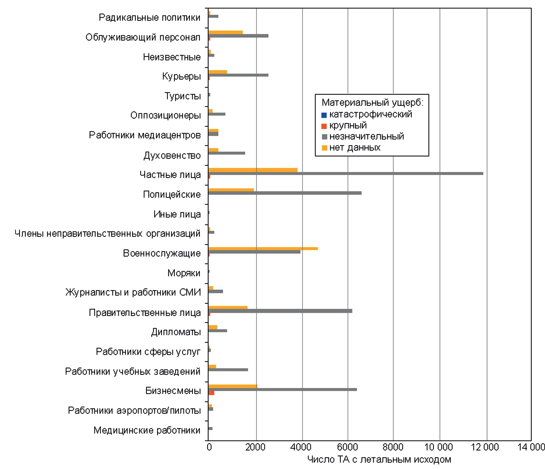 Среди ТА против частных (гражданских) лиц 75 % отнесено по ущербу к ТА с незначительными последствиями. При этом, имея сопоставимые объемы в структуре объектов, бизнесмены становятся лидерами по количеству крупных по ущербу терактов (30 %). Это, вероятнее всего, коррелирует с уровнем жизни и стоимостью предметов, окружающих объект ТА в данном случае. Объекты из категории