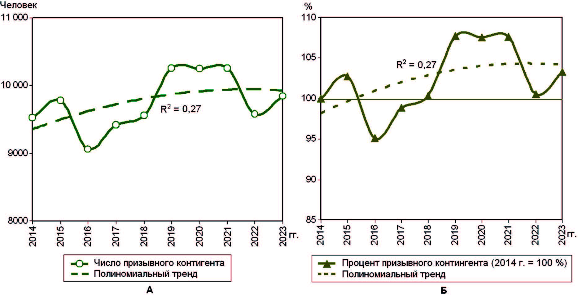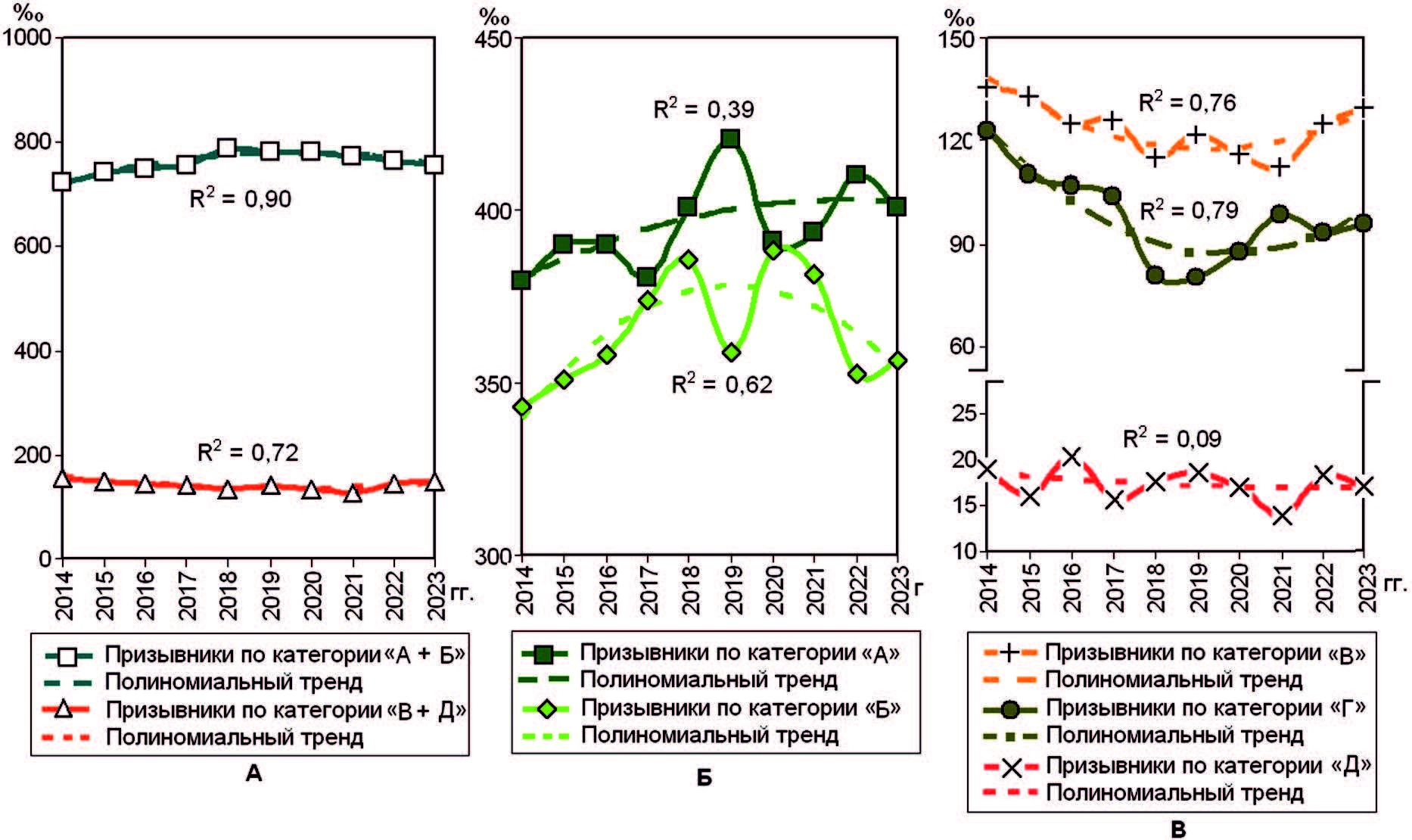 Methods. The study relied on Rosstat statistics for the Orenburg region, as well as reports and records of the Military Medical Expertise Center at the Federal Budgetary Institution “Military Commissariat of the Orenburg Region” collected over a decade’s timespan from 2014 to 2023. Conscripts were split into the following categories labelled by letters of the Russian alphabet: ‘A’ for fit for military service, ‘B’ for fit for military service with minor restrictions, ‘V’ for fit for military service with limitations, ‘G’ for temporarily unfit for military service, ‘D’ for unfit for military service. In addition, conjoined analysis of A & B categories of conscripts fit for military service vs V & D ‘unfit or fit for military service with limitations’ was performed for peacetime settings. The incidence of diseases in conscripts was correlated with relevant chapters of the International Classification of Diseases and Behavioral Disorders (ICD-10); calculations per 1000 conscripts (‰) were carried out. The obtained dynamics across different indicators was studied using dynamic series analysis and second-order polynomial trend; the determination coefficient was calculated as well.