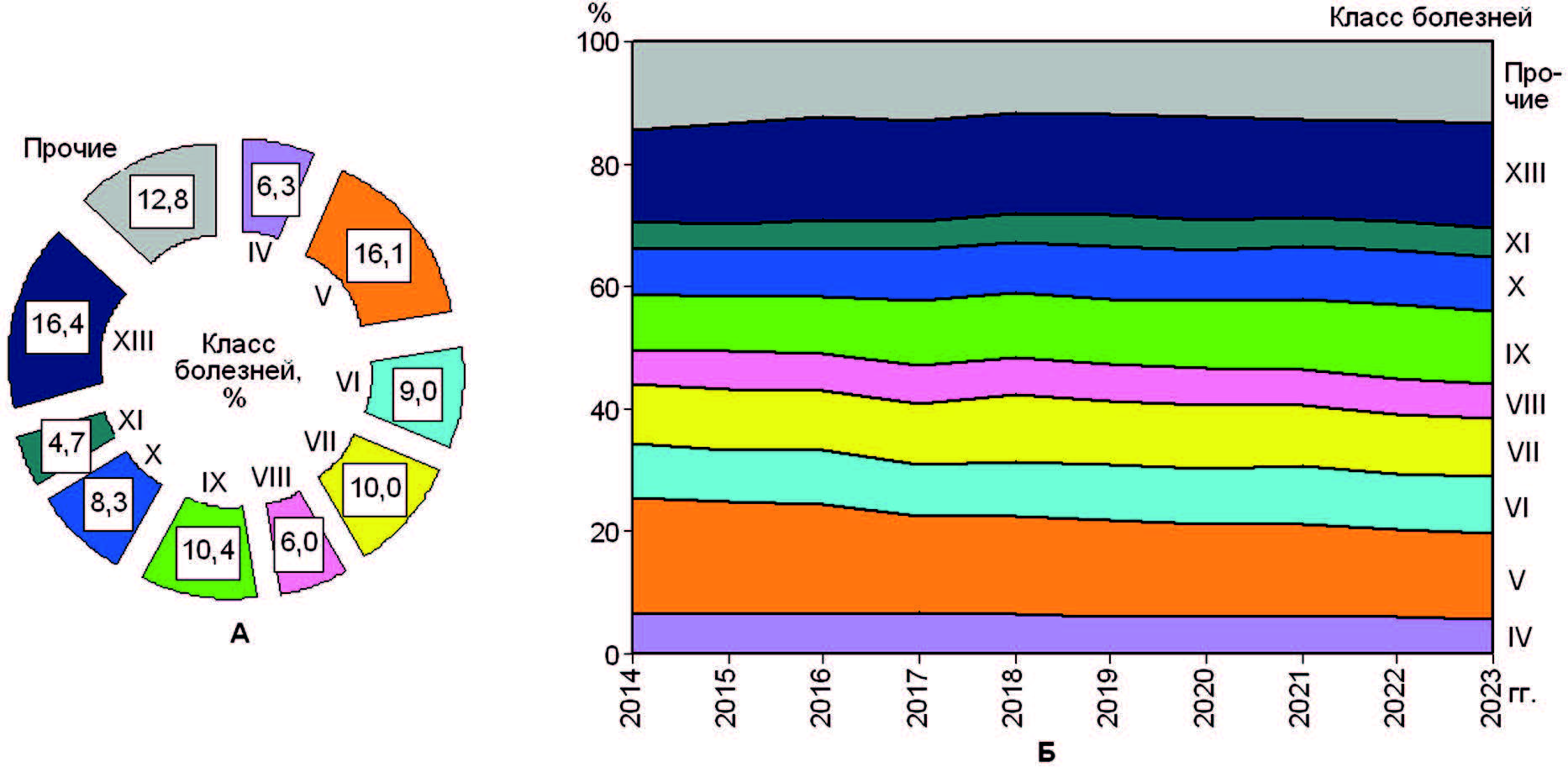 Results and discussion. Within the last decade, the number of conscripts in the Orenburg region has not shown any significant dynamics and is likely to remain unchanged in the coming years. The results showed that every 1,000 of examined conscripts included 761 those who were fit for military service, 98 needed treatment or rehabilitation, and 141 were unfit or fit with limitations. The annual disease incidence rate among B & D category conscripts was (141.6 ± 2.6) ‰, standing for 14.1% of all the examined conscripts. In terms of significance, rank 1 was assigned to musculoskeletal and connective tissue (ICD-10, Chapter XIII), rank 2 to mental and behavioral disorders (Chapter V), rank 3 to circulatory diseases (Chapter IX), rank 4 to diseases of the eye and adnexa (Chapter VII), rank 5 to nervous system disorders (Chapter VI). Among all military service exemption causes in conscripts, cumulative specific contribution of these diseases was 61.9%. In 2014-2023, the average of 8.3% of conscripts needed conservative treatment, with treatment provided to 87.1% of those in need of treatment; 1.5% needed surgical treatment (treatment received by 79.4%) and 48.3% needed oral cavity sanitation (79.4% treated accordingly). Conscripts with eye-sight disorders underwent vision correction.