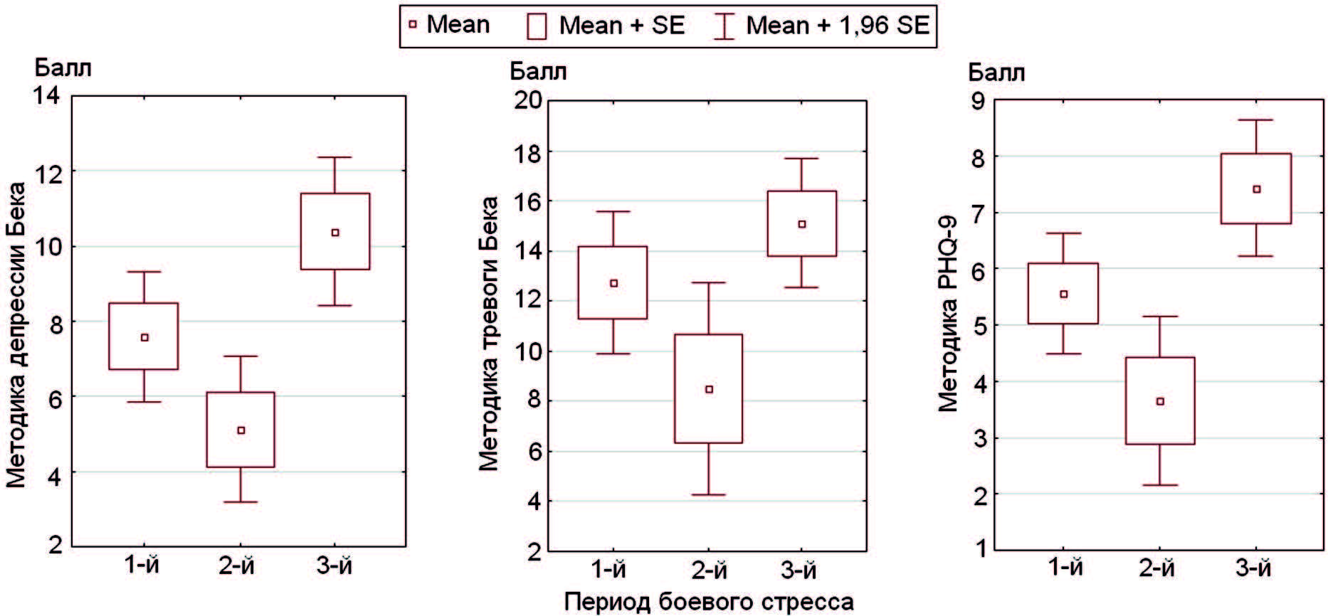 При помощи дисперсионного анализа выявлены статистически достоверные различия показателей во 2-м периоде по сравнению с 3-м – по методике депрессии Бека (p = 0,003), тревоги Бека (p = 0,011), PHQ-9 (p = 0,001); в 1-м периоде по сравнению с 3-м – по методике депрессии Бека (p = 0,042), PHQ-9 (p = 0,030) (рис. 2). При помощи непараметрического теста Манна–Уитни статистически значимые различия обнаружены при сравнении показателей 1-го периода со 2-м – по методике тревоги Бека (p = 0,022) и PHQ-9 (p = 0,024), 2-го периода с 3-м – по методике PHQ-9 (p = 0,028), 1-го периода с 3-м – по методике депрессии Бека (p = 0,004), тревоги Бека (p = 0,001), PHQ-9 (p = 0,001). В связи с незначительной выраженностью ПТСР у комбатантов по результатам миссисипской шкалы и PC-PTSD-5 различия показателей по периодам боевого стресса наблюдались на уровне тенденций.