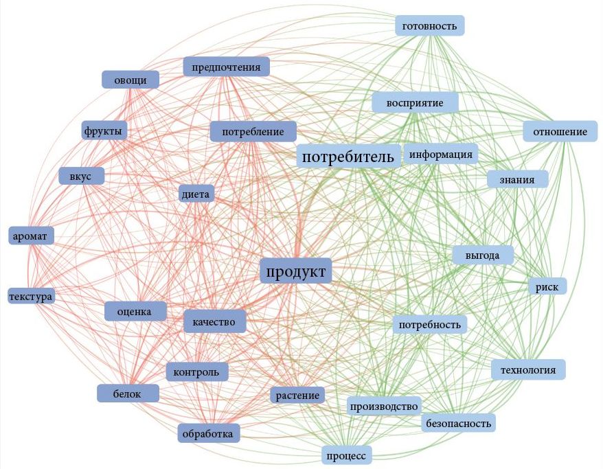 Основными факторами, определяющими потребительские решения, выступают вкус, цена и уровень переработки. Поскольку принятие различных пищевых продуктов потребителями широко изучается, анализ научных публикаций, проиндексированных Web of Science, за последние полвека позволяет определить ряд важных для нашего исследования характеристик. На рис. 3 обобщены более 11 000 аннотаций к исследованиям; соответствующие факторы разделены на два принципиально различных кластера.