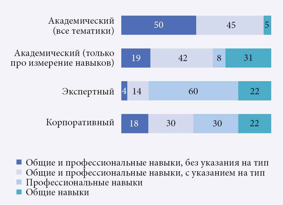 Господствующий экспертный дискурс тяготеет к обсуждению либо только общих компетенций (31% публикаций), либо универсальных и профессиональных навыков вместе, продолжая отделять их друг от друга и относя последние к категории специфических. Наиболее авторитетные экспертные публикации зачастую опираются на ведущие академические работы, во многом заимствуя их подход и выводы. Выраженный интерес к общим навыкам отчасти связан с мейнстримной концепцией обучения в течение всей жизни (lifelong learning), которую продвигают экспертные организации (OECD, 2021; UNESCO, 2023). Ключевую роль в этой повестке играют именно универсальные компетенции, а навыки, укорененные в рабочем контексте, отодвинуты на второй план.