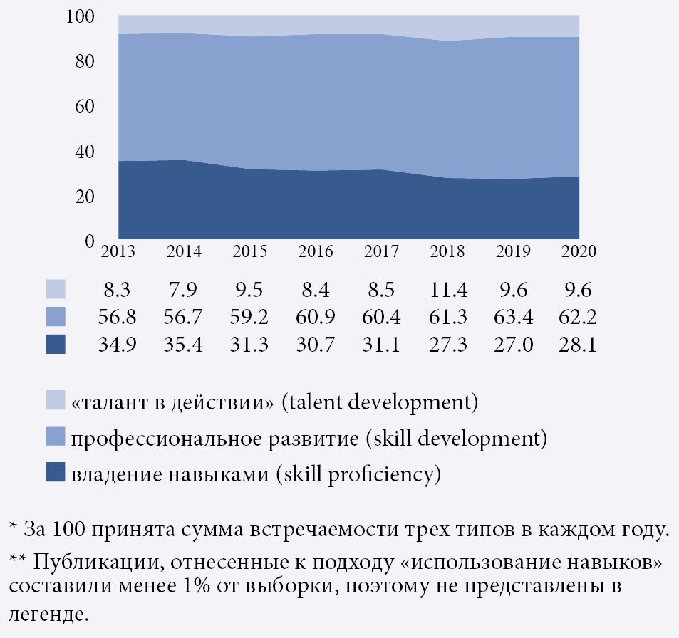 Обзор научных публикаций за 2013–2020 гг. по теме навыков, выявленных системой iFORA (рис. 2), демонстрирует преобладание дискурса развития навыков / профессионального развития (skill development) — частота встречаемости более 60%. Это может быть связано с международным распространением повестки обучения в течение всей жизни9, ростом числа исследований, демонстрирующих позитивные индивидуальные и страновые эффекты от развития конкретных компетенций. В трети профильных научных работ фиксируется нарратив владения навыками, популярность которого за период наблюдения заметно снизилась (с 35% до 28%) при одновременной экспансии дискурса профессионального развития (с 57% до 62%) и «таланта в действии» (c 8% до 10%). Это может свидетельствовать о постепенном сдвиге от традиционной логики владения конкретными компетенциями и ее оценки к идее их непрерывного развития и шире — комплексного и агентного развития человеческого потенциала.