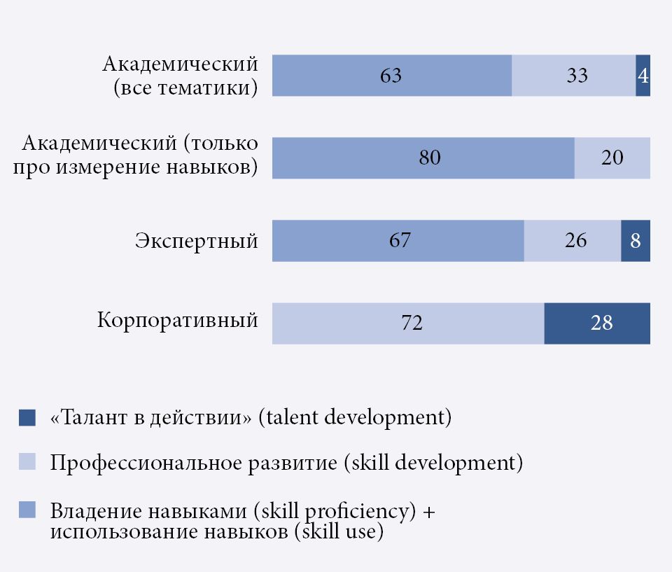 Рис. 3. Превалирующие типы международного академического (база Scopus), экспертного и корпоративного дискурса о навыках (% от всех упоминаний в публикациях 2013–2020 гг.) (N=183)