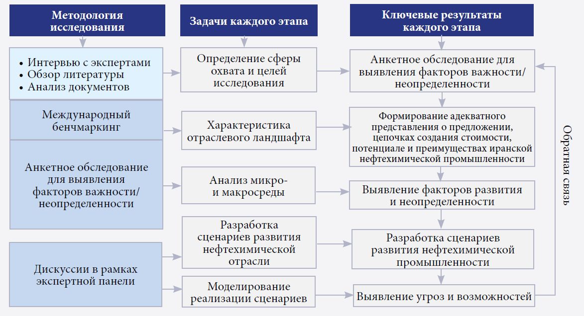 Далее группа исследователей и отраслевых экспертов, опиравшихся на собственные знания и представления, разработала логику, структуру и содержание сценариев. Чтобы наполнить их фактурой и углубить понимание их возможных последствий, была смоделирована реализация каждого из них для ключевых игроков. Подобная структурированная методология позволила выполнить глубокий и робастный анализ перспектив развития иранской нефтехимии, способный помочь заинтересованным участникам отрасли в принятии обоснованных решений и стратегическом планировании.