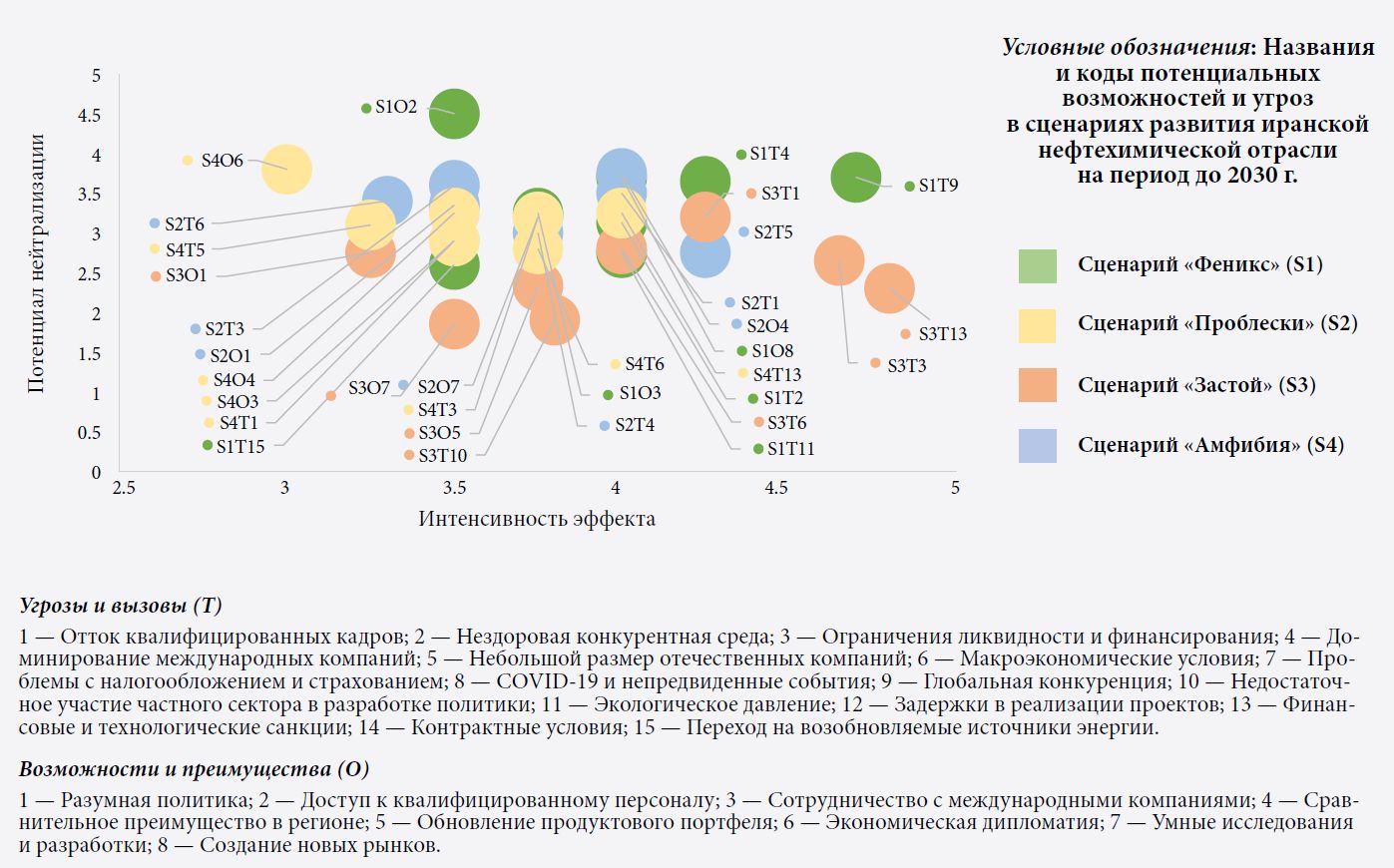Рис. 9. Схема ключевых возможностей и угроз, описанных в четырех сценариях развития нефтехимической промышленности Ирана на период до 2030 г.