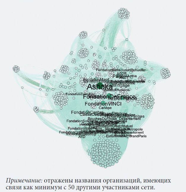 В нашей предыдущей работе (Desmarchelier et al., 2020) предложен альтернативный подход: в качестве исходной точки берется поставщик ИСУ «Новое агентство активной солидарности» (Agence Nouvelle des Solidarités Actives, ANSA), вокруг которого конструируется сеть социальных инноваций на базе списка поддерживаемых этим агентством инновационных проектов. ANSA — относительно молодая организация (основана в 2006 г.). Сеть оказалась слишком малочисленной (всего 134 члена) и недостаточно плотной, чтобы служить адекватным примером НССИ. Чтобы охарактеризовать французскую НССИ, в данной статье мы воспроизводим наш подход в укрупненном масштабе, используя информацию о деятельности поставщика ИСУ с более длинной историей — Ashoka, американской организации, занимающейся продвижением социального предпринимательства по всему миру. Ashoka, основанная в 1980 г. уже упоминавшимся Биллом Дрейтоном, поддерживает социальных предпринимателей, помогая приобрести необходимые навыки и интегрироваться в сеть других подобных организаций. Ее бенефициары именуются «стипендиатами Ashoka» (Fellows Ashoka), среди них — 72 проекта, получивших поддержку во Франции2.