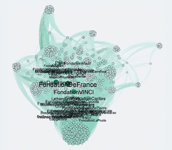 На сайтах проектов обычно указываются все участники, что позволяет построить матрицу взаимосвязей между ними. Поскольку степень финансовой вовлеченности субъектов нам неизвестна, использовался двоичный код: 1 — участие, 0 — его отсутствие. Фрагмент матрицы представлен в табл. 1, из которой видно, что многие организации задействованы в проекте «Маленькие столовые» (Le petites cantines)3. Кроме того, Fond Groupe SEB вовлечен в инициативу «Пути будущего» (Chemins d’avenir), а La France s’engage и Fondation de France — участники «Активного действия» (Active Action). Такое перекрестное участие обеспечивает связь проектов и способствует формированию плотной сети социально мотивированных организаций.