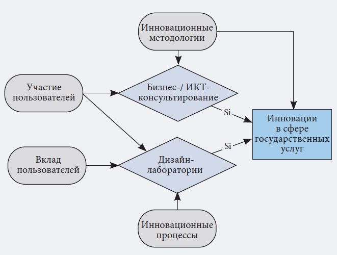 Оба направления связаны с вовлечением пользователей в инновационные процессы ИДУ и ИКТ-консалтинга для совершенствования государственных услуг в форматах совместных создания и дизайна. Будучи важным элементом инновационной деятельности в общественном секторе, эти партисипативные процессы обеспечивают повышение качества государственных услуг (Yu, Sangiorgi, 2017, p. 82). Тем самым в создании последних активно участвуют поставщики ИДУ и ИКТ-услуг, которые в свою очередь вовлекают пользователей в эти процессы (Schmidthuber et. al. 2019, p. 345).