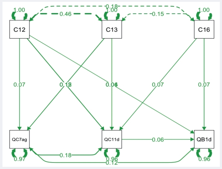 Для применения SEM в сочетании с анализом пути при оценке на первом этапе были использованы результаты логит- и пробит-моделей с высокой ковариацией зависимых переменных. На втором этапе анализ пути был загружен в программное приложение SEM (статистический пакет Lavaan for R) вместе с уравнениями, полученными на предыдущем этапе регрессии. Результаты представлены на приведенных далее диаграммах.