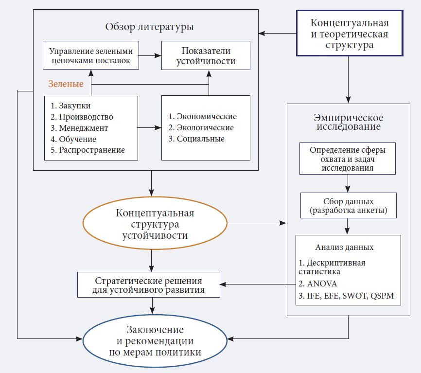 На базе существующей литературы (научных докладов, статей в академических журналах и документов государственных органов), посвященной зеленым цепочкам поставок и показателям устойчивого развития, была разработана структурная модель исследования (рис. 1). С ее помощью были определены охват, потенциальные участники и размер выборки. Первоначальный вариант анкеты был протестирован на пилотной выборке респондентов. Анкета была доработана с учетом их комментариев, после чего проводился полномасштабный сбор первичных данных. Изучение полученных мнений и их сопоставление с выводами, изложенными в опубликованных источниках, позволили выдвинуть ряд общих рекомендаций по управлению зелеными цепочками поставок.