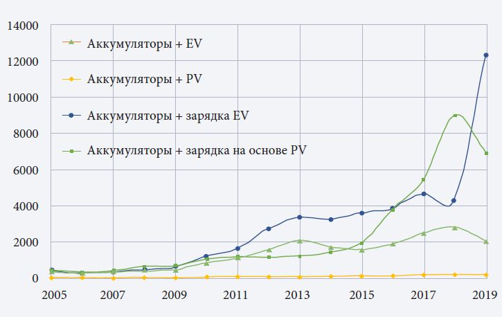 Интерес к технологиям на основе твердых электролитов вызван стремлением повысить плотность энергии и безопасность аккумуляторов (Kim et al., 2015). Твердотельные аккумуляторы представляют собой комплексную конструкцию, интегрирующую несколько технологий. В последние годы наблюдается быстрый рост числа связанных с ними патентов (более 30% в год с 2011 г.), которое в 2019 г. оказалось выше, чем для всех не ионно-литиевых технологий. Приведенная динамика свидетельствует о растущей значимости таких решений и о возможном появлении новой траектории технологического развития.