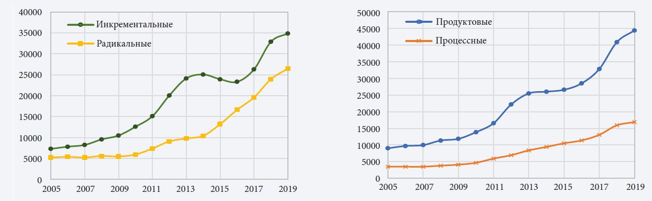 Наиболее популярной классификацией инноваций, пожалуй, являются концепции продуктовых (новые или существенно модернизированные продукты) и процессных инноваций (новые или более совершенные методы производства либо распределения продукции) (Fagerberg, 2004). Продуктовые инновации являются прямым результатом экономической деятельности, тогда как процессные связаны с соотношением «затраты – результаты»7. В случае аккумуляторов, в качестве примера инновационного продукта можно привести модернизированные модели батарей, тогда как новые методы их сборки относятся к инновационным процессам.