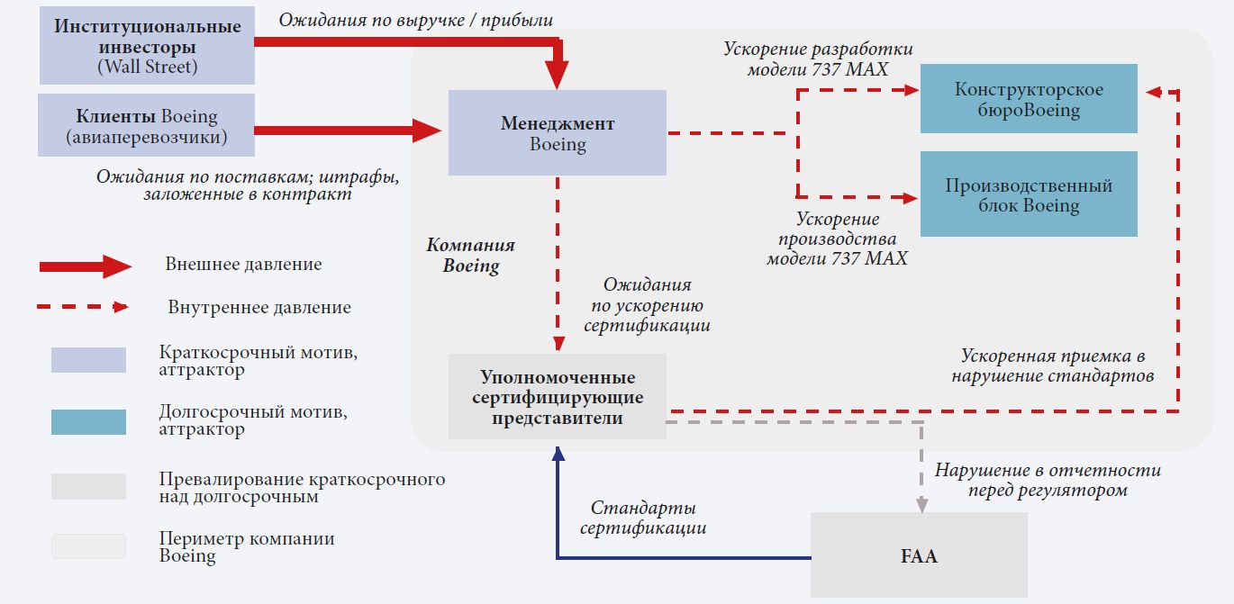 В отчете экспертов, расследовавших причины трагедий, значительное внимание уделялось обсуждению «гонки производства» по сборке моделей Boeing 737 MAX. Компания стремилась максимально быстро поставлять самолеты заказчикам. Если в 2010 г. производительность составляла чуть более 30 самолетов в месяц, то в 2014 г. эта цифра достигла рекордного на тот момент для Boeing значения 42, а незадолго до первой катастрофы ее планировалось увеличить до 57. Фокус на динамике финансовых показателей вытеснил более важную цель — внедрение новейших технологий безопасности и инноваций в целом — и привел к повышенной нагрузке на производство.6 В совокупности все это повлекло за собой серьезную деградацию системы безопасности полетов.