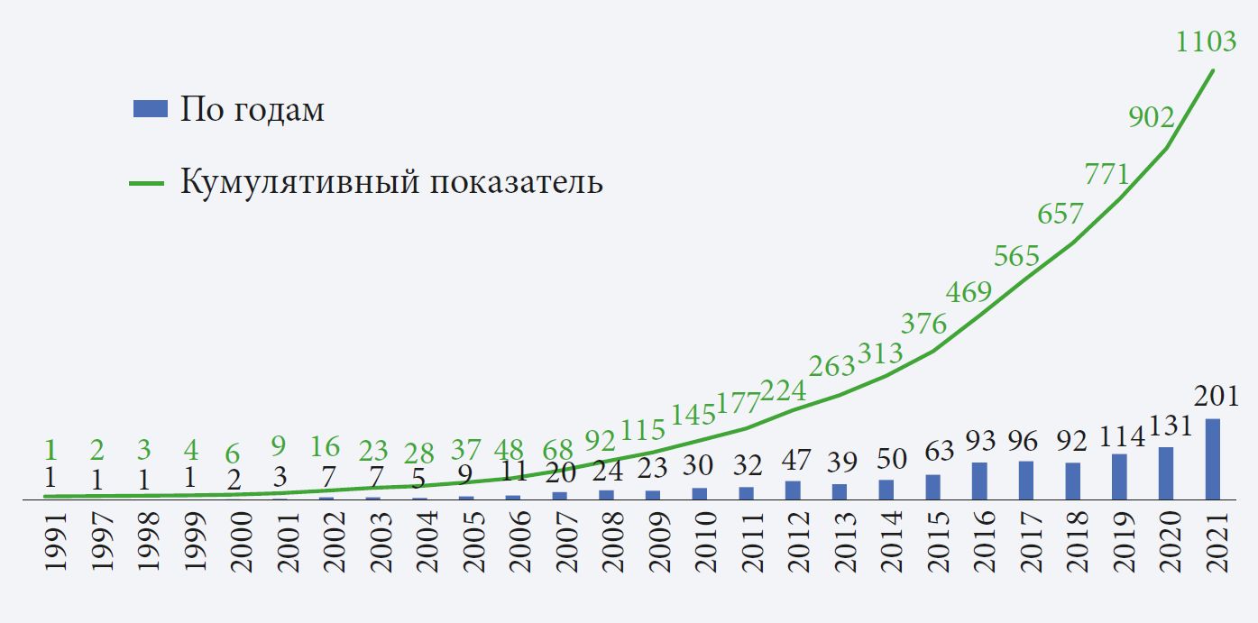 Классификация TRL с момента создания в 1960-е гг. оперировала семью уровнями, но с 1990-х гг. их число расширилось до девяти. Тогда же были составлены детальные определения для каждого уровня (Mankins, 2009), которые, впрочем, оказались недостаточными. Учитывая высокую популярность рассматриваемой типологии, многие организации и отрасли адаптировали ее к собственным потребностям. Актуальность системы TRL подтверждена библиометрическим анализом, выявившим рост числа посвященных ей публикаций (Araujo, 2020). Исследование проводилось по материалам базы данных «ядра» Web of Science за 1991–2021 гг. с применением поисковой формулы «technology readiness level OR technology readiness levels» (рис. 3). Ограничение периода поиска 1990-ми гг. связано с датой первой публикации, в которой упомянуты девять уровней технологической зрелости. Всего опубликованы 1103 статьи по теме TRL в 71 стране, из которых основная доля приходится на США (39% всех публикаций), Англию (12%) и Германию (11%). Они распределились по 124 тематическим категориям. Из общего массива работ 53% относятся к прикладным областям, в том числе 19% — к аэрокосмической индустрии.