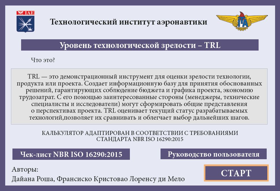 Чтобы устранить ограничения инструментария TRL, накладываемые стандартом ISO 16290:2013, упростить его применение и расширить сферу охвата, была введена спецификация NBR ISO 16290:2015 (далее — NBR ISO), дополненная новыми критериями: экономические, политико-правовые и технические аспекты, а также возможность управления знаниями. Первая версия калькулятора разработана на основе опыта NASA, ESA, DoD и AFRL и контрольного списка ISO 16290:2013. Ряд бразильских институтов развития оценили калькулятор TRL как эффективный и простой в использовании.15 С ним работают многие научные сотрудники IAE.16
