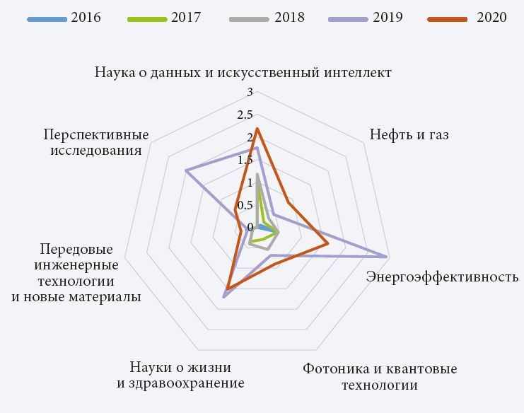 Прикладные исследования составляют важную часть деятельности Сколтеха. Рис. 2 отражает существенный рост объема финансирования, привлеченного на такие исследования в 2016–2020 гг. Наиболее промышленно ориентированными направлениями вуза остаются «Наука о данных и ИИ» и «Нефть и газ». «Перспективные исследования» в силу их фундаментального характера вообще не привлекли индустриального финансирования. Минимальное привлечение внешнего финансирования ресурсов продемонстрировали «Науки о жизни», а также «Фотоника и квантовые материалы», наиболее удачным для которых стал 2019 г. В целом диаграмма демонстрирует неуклонный рост привлеченного финансирования прикладных исследований из года в год практически по всем направлениям.
