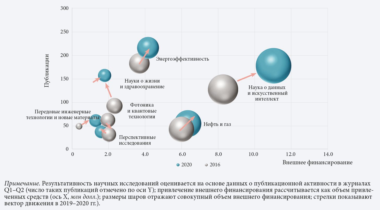 С 2016 по 2020 гг. «Наука о данных и ИИ» и «Нефть и газ» стали гораздо более промышленно-ориентированными. На рис. 5 представлены изменения, произошедшие в 2019–2020 гг. Оба используемых индикатора с очевидностью улучшились в случае «Энергоэффективности», повысив сбалансированность этого направления. Если по «Нефти и газу» число публикаций выросло, то в направлениях «Науки о жизни» и «Фотоника и квантовые материалы» несколько снизилось, однако, увеличился объем привлеченного финансирования. «Наука о данных и ИИ» и «Инженерные технологии и новые материалы» с поправкой на масштаб демонстрируют сходную динамику.