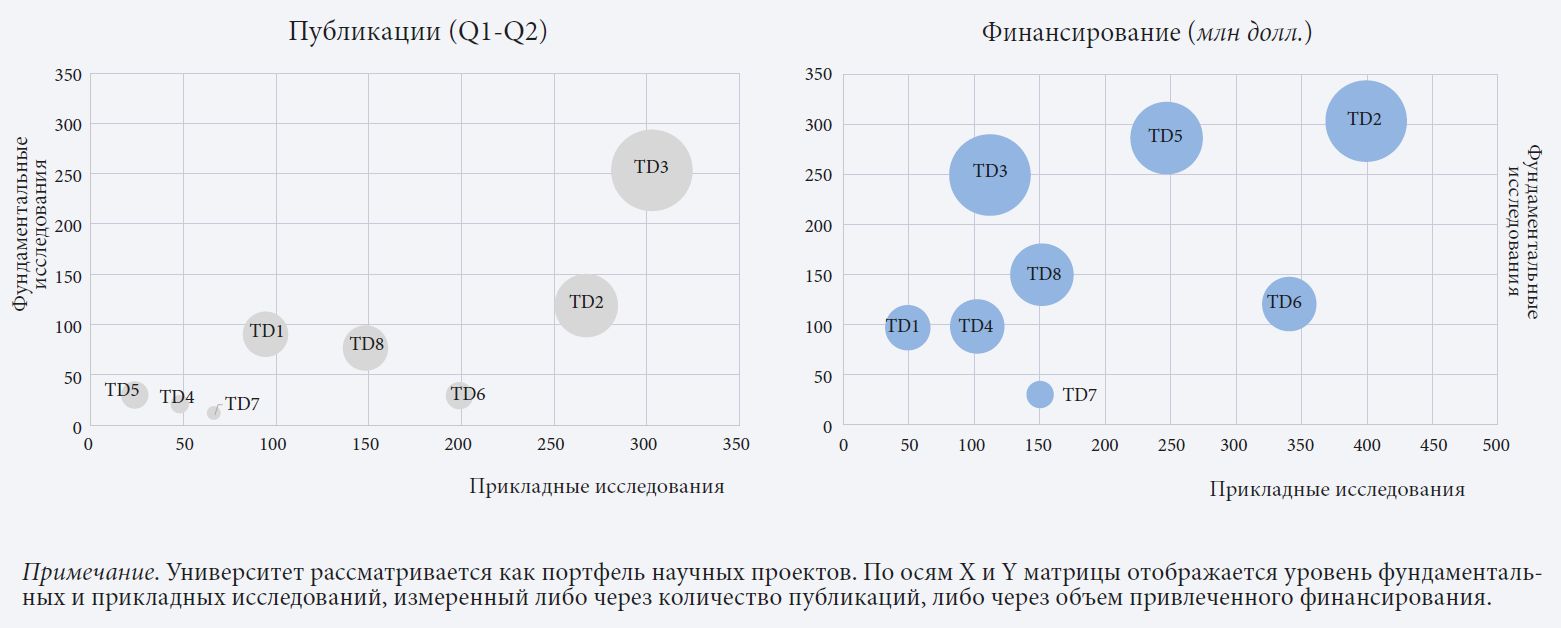 Рис. 6. Подход на основе матрицы портфеля исследовательских направлений (RDPM), классифицирующий приоритетные направления исследований гипотетического университета на фундаментальные или прикладные