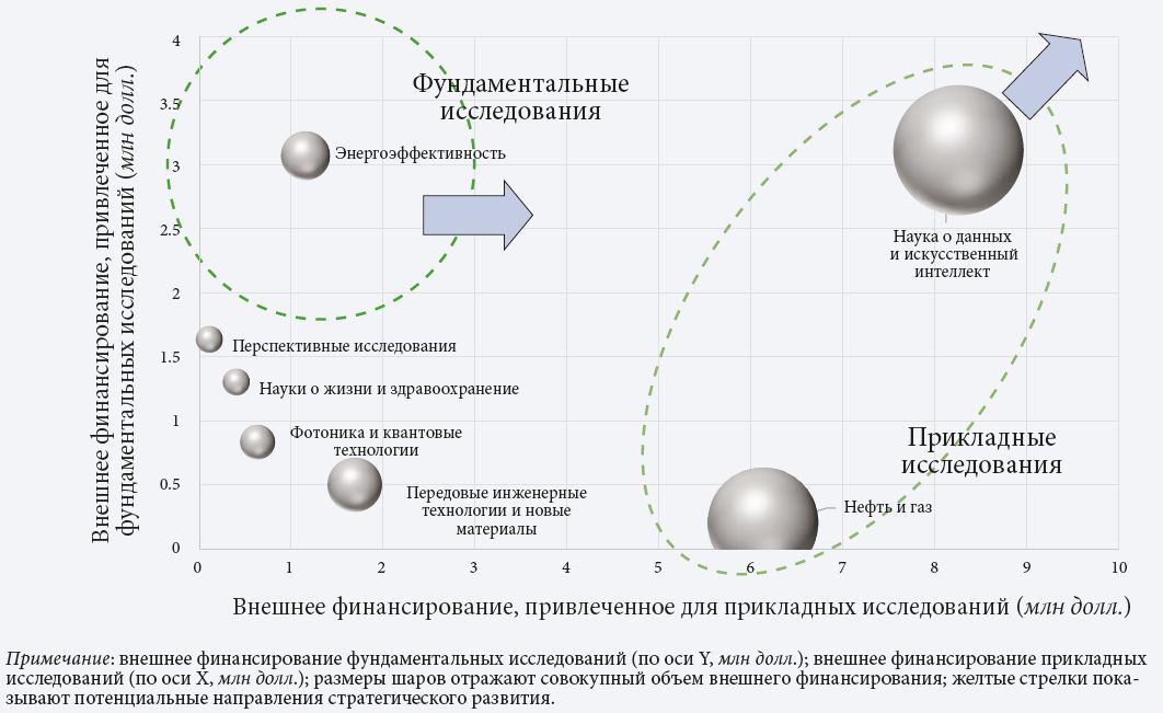 Возможны исключения из этого правила, например, когда компании рассматривают научные исследования в долгосрочной перспективе и готовы финансировать даже фундаментальные разработки в областях, которые считают наиболее перспективными и приоритетными (квантовые технологии, новые математические методы и т. п.). Из более 850 проанализированных нами проектов лишь менее десяти реализуемых совместно с партнерами из промышленного сектора можно отнести к категории фундаментальных исследований (с результатами, потенциально пригодными для внедрения в горизонте более 5 лет).