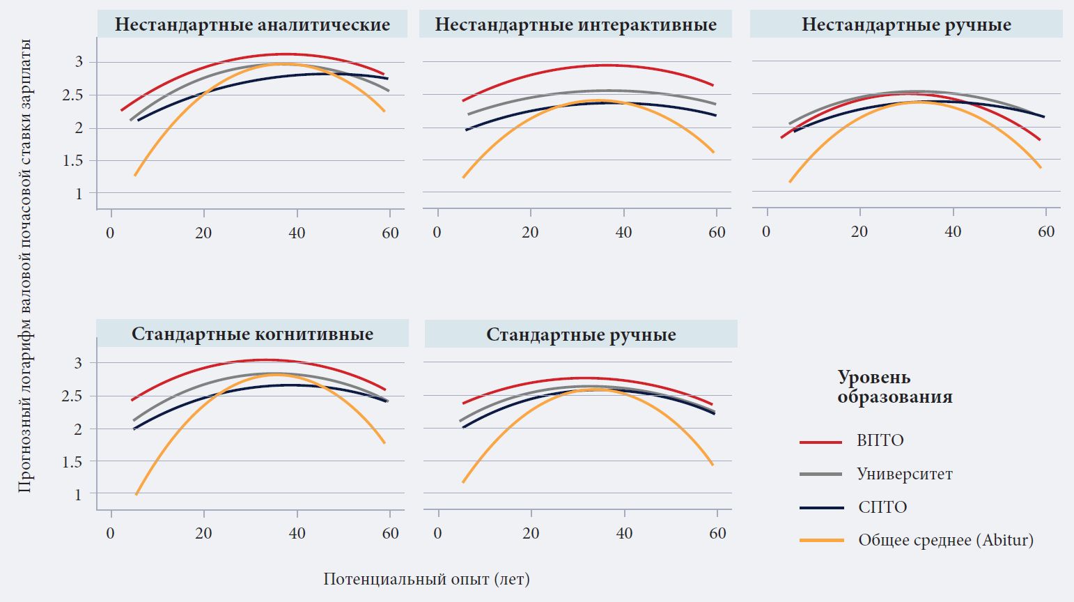Для углубленного понимания различий в темпах обесценивания мы построили предиктивные профили «заработок–опыт» для разных типов задач на основе результатов спецификации модели 5. Из рис. 1 видно, что профили доходов существенно варьируют по типам функций и уровням образования. Величина оплаты труда, включая надбавки за образование, в целом ниже для выполняющих ручные задачи и выше для тех, кто отвечает за аналитические, интерактивные и когнитивные. К завершению карьеры доходы специалистов с СПТО оказываются выше, чем у обладателей ВПТО. В случае уникальных ручных задач СПТО и ВПТО обеспечивают более значительный доход, чем общее высшее образование. Кроме того, заработная плата выпускников средних школ быстро достигает пика, и в течение некоторого времени они опережают по этому показателю работников с СПТО и ВПТО, а затем резко сдают позиции. Несмотря на пониженную образовательную квалификацию, в начале карьеры различия в уровне амортизации могут в отдельных случаях компенсировать разницу в доходах. Следовательно, даже выпускникам университетов требуется постоянно обновлять знания, чтобы поддерживать ценность своего ЧК.