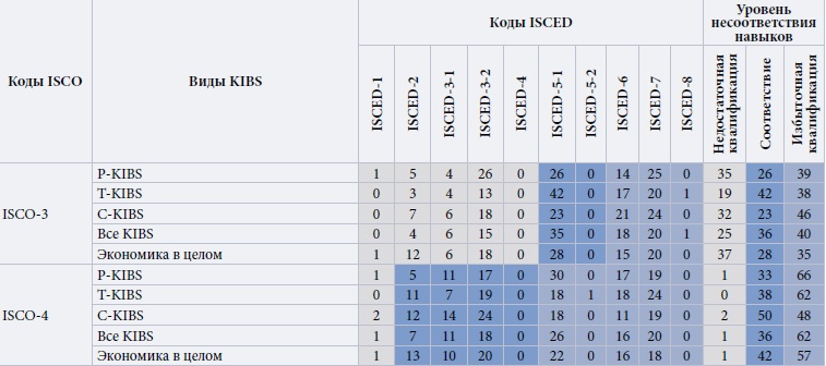 Однако работы, в которых анализируются взаимоотношения поставщиков KIBS с организациями ПТО, пока немногочисленны. На значимость носителей средней квалификации в создании продукции KIBS первым указал Еврофонд (Eurofund, 2006). Предполагается, что спрос компаний KIBS на обладателей ПТО будет расти ввиду необходимости осваивать новые технологии (Consoli, Elche, 2010). Анализ профессиональных структур KIBS на основе Международной стандартной классификации профессий (International Standards Classification of Occupations, ISCO) позволил проследить их эволюцию и выявить тенденции в деятельности вспомогательного технического персонала (группы ISCO-3 и ISCO-4, принадлежность к которым предполагает наличие ПТО) (ILO, 2012; Miles et al., 2019). Отмечено сокращение доли этих групп в KIBS на фоне категории «специалисты» (ISCO-2). Исследование, проведенное в Финляндии, выявило, что основными клиентами политехнических школ выступают малые и средние компании, инновационная деятельность которых направлена скорее на поиск практических решений, чем на развитие науки (Marttila et al., 2008). Однако ни в одной из этих работ занятость обладателей ПТО в компаниях KIBS не изучается. Выявить возможный дисбаланс компетенций и оценить роль таких кадров в деятельности компании позволит анализ связей между профессиональной структурой поставщиков KIBS и образованием их сотрудников.