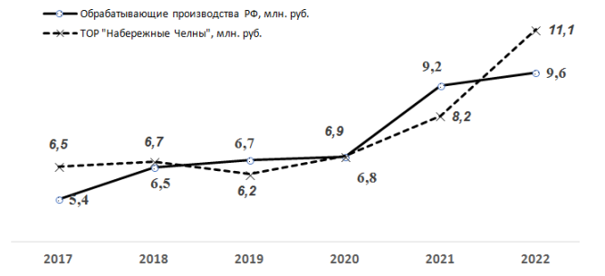 Влияние деятельности режима ТОР на качество жизни определялось на примере Набережных Челнов, который первым получил статус ТОР (январь 2016 г.) и первые четыре компании в реестре резидентов Министерства экономического развития РФ включены также из этого города. Показатели резидентов (производительность труда, среднемесячная заработная плата, количество создаваемых рабочих мест, фонд заработной платы, отчисления в социальные фонды, рентабельность производства) рассчитывались на основе официальной налоговой отчётности. Большинство показателей рассматривалось с учётом кодов ОКВЭД, которые представлены в реестре резидентов11. Анализ проведён на основе общероссийских и региональных показателей, которые представлены на официальном сайте ФСГС12.