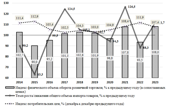 Рисунок 2. Темпы роста/снижения оборота розничной торговли (в сопоставимых ценах), потребительских цен и общего объёма импорта товаров, % к предыдущему году. Россия. 2014-2023 гг.