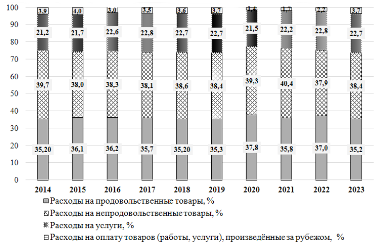 В среднестатистической структурной модели потребления, сложившейся в 2014-2023 гг., расходы на продовольственные товары занимали от 35,2 до 37,8%. Доля расходов на непродовольственные товары была выше (от 37,9 до 40,4%), чем доля расходов на продовольственные товары, а на услуги, напротив, она была ниже (от 21,2 до 22,8%) (рисунок 3). Доля расходов на оплату товаров (работы, услуги), произведённые за рубежом, была незначительной - от 1,4 до 4,0%15. Высокая чувствительность к кризисам проявилась в структурах потребления 2015, 2020, 2022 годов, когда ощутимо выросли доли расходов на продовольственные товары (+0,9 п.п.; +2,5 п.п.; +1,3 п.п., соответственно).
