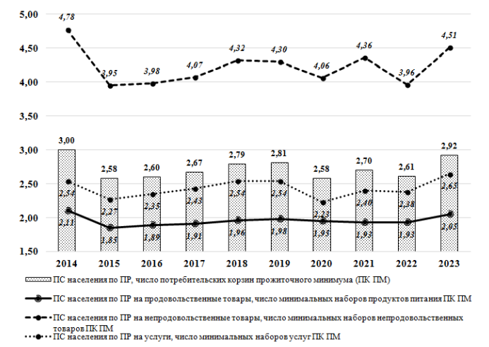 Расчёты показывают, что в среднедушевом измерении покупательная способность населения по потребительским расходам, включающим расходы на продовольственные товары, непродовольственные товары и услуги, составила от 2,58 (2015 и 2020 гг.) до 3,00 (2014 г.) наборов потребительских корзин прожиточного минимума (ПК ПМ). Наиболее низкой она сложилась по расходам на продовольственные товары - от 1,85 (2015 г.) до 2,11 (2014 г.) минимальных наборов продуктов питания ПК ПМ. По расходам на услуги покупательная способность населения составила от 2,23 (2020 г.) до 2,65 (2023 г.) минимальных наборов услуг ПК ПМ. Наиболее высокий уровень показателя отмечается по расходам на непродовольственные товары - от 3,95 (2015 г.) до 4,78 (2014 г.) минимальных наборов непродовольственных товаров ПК ПМ, что указывает на более значительный потенциал этой составляющей по сравнению с другими составляющими для формирования кризисной стратегии экономии на потреблении.