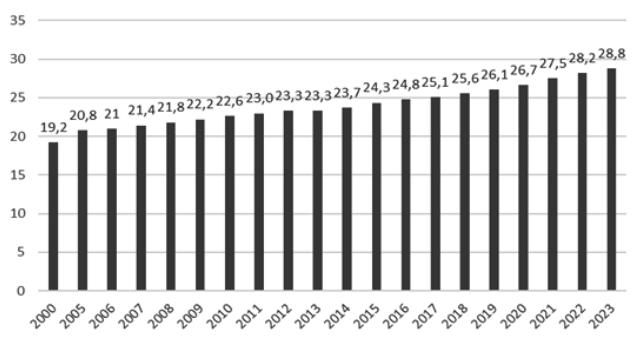 В период с 2000 по 2023 гг. общая площадь жилых помещений, приходящаяся в среднем на одного жителя Российской Федерации, неуклонно росла от 19,2 м2 в 2000 г. до 28,8 м2 в 2024 г. (рисунок 1).