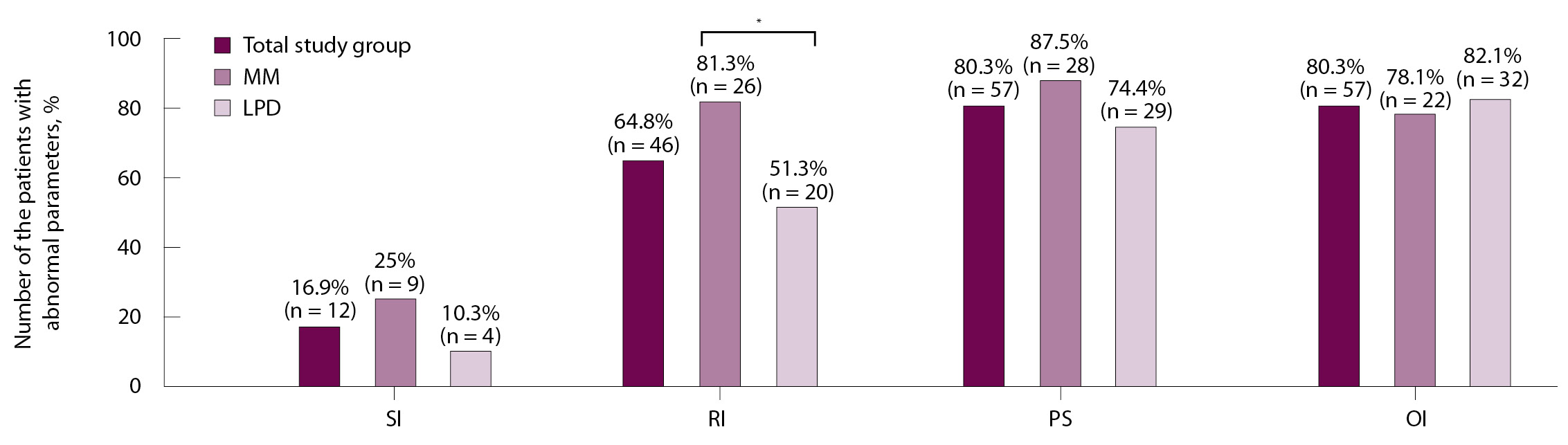 Рис. 1. Частота выявления нарушений артериальной функции у пациентов с гемобластозами до проведения высокодозной химиотерапии с аутологичной трансплантацией гемопоэтических стволовых клеток. Данные представлены в виде абсолютных и относительных значений; OI – индекс окклюзии, PS – сдвиг фаз, RI – индекс отражения, SI – индекс жесткости; * наличие статистически значимых (р < 0,05) различий между группами пациентов с множественной миеломой (ММ) и лимфопролиферативными заболеваниями (ЛПЗ)