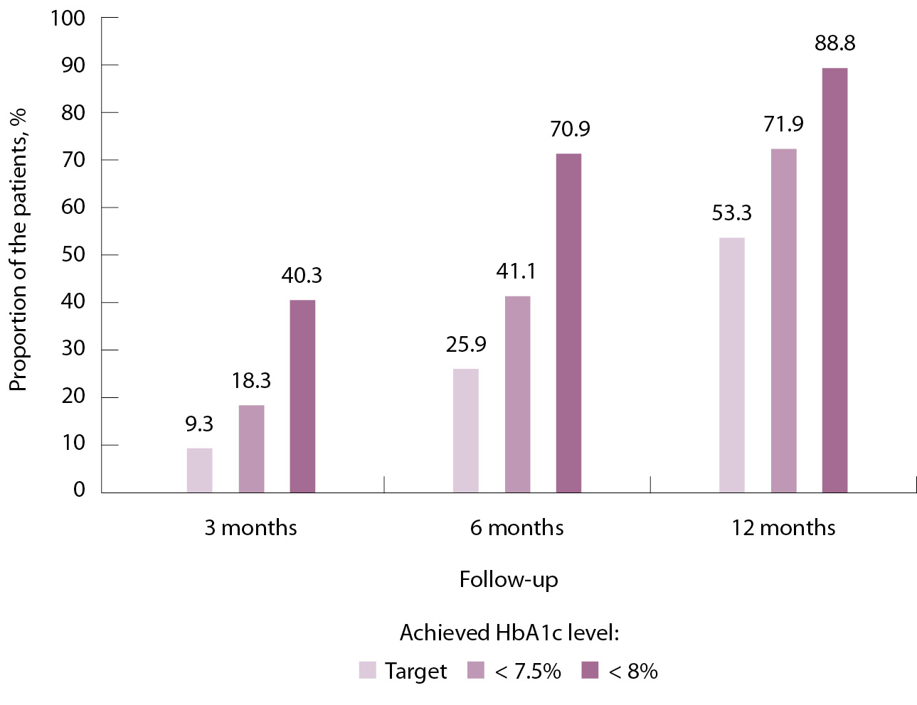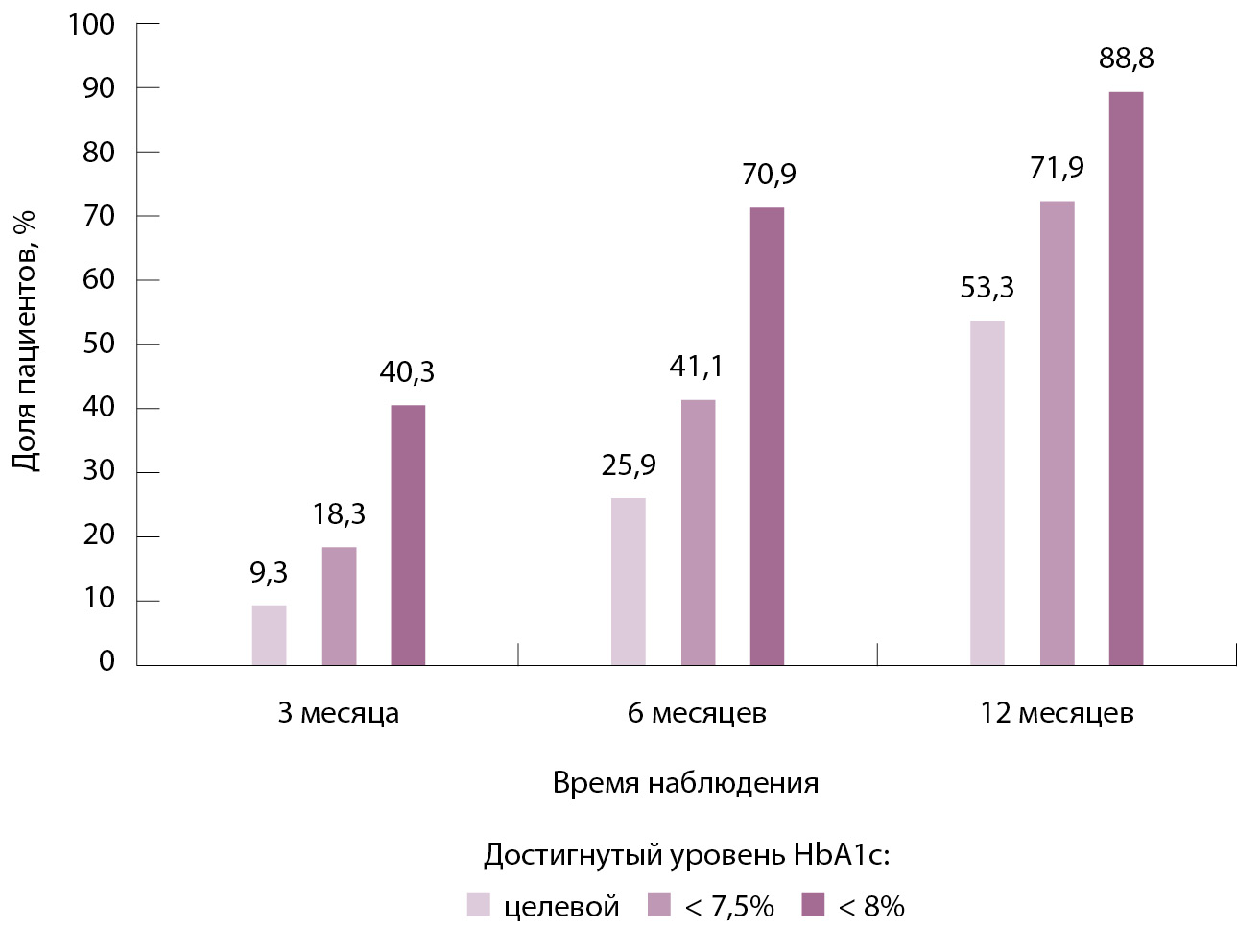 Основной исход исследования. Первичная конечная точка – доля пациентов, достигших индивидуального целевого уровня HbA1c через 6 месяцев. Если не был указан индивидуальный целевой уровень HbA1c, таковым считался < 7,0%.