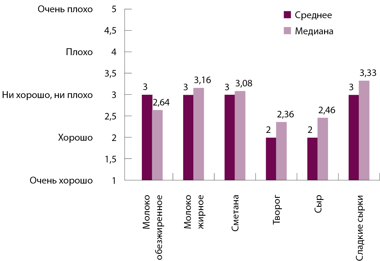 Учитывая выявленные взаимосвязи многих аспектов пищевых восприятий, мы сочли, что восприятие каждого продукта в целом целесообразно представить в виде среднего суммарного балла всех пищевых восприятий и медианы (рис. 2). Из рисунка хорошо видно, что больные СД2 в целом отдают предпочтение обезжиренному творогу и сыру, далее с некоторым отрывом следует обезжиренное молоко. Сметана парадоксально (то есть несмотря на высокое содержание жиров) воспринимается как в целом нейтральный продукт, а жирное молоко и сладкие сырки – закономерно как скорее вредные, чем полезные продукты.