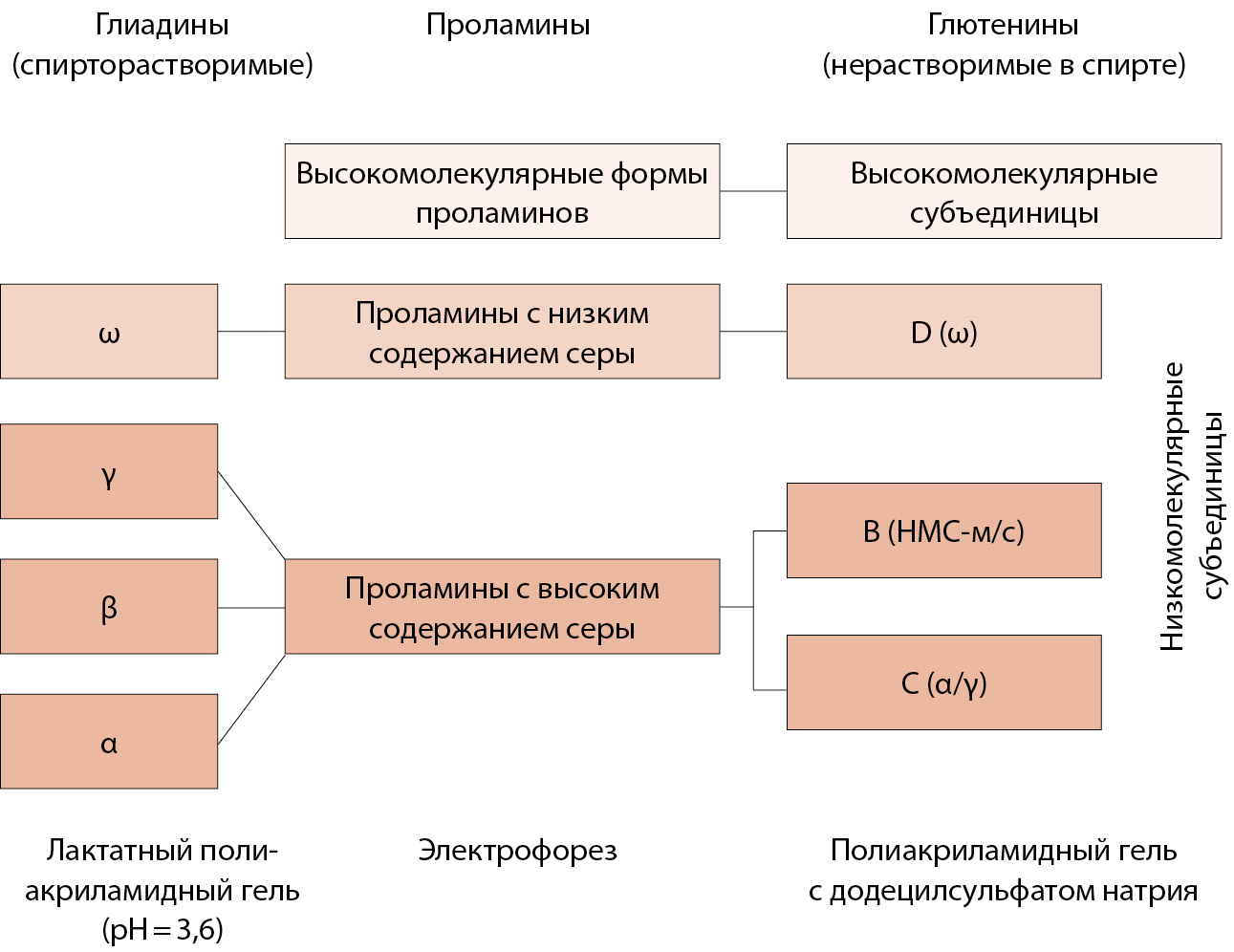 И хотя классификация глиадины/глютенины обеспечивает ценную операционную основу, изученные аминокислотные последовательности отдельных белков позволили ввести дополнительную классификацию, основанную на молекулярных свойствах, которая выделяет такую группу белков пшеницы, как проламины – запасные белки пшеницы. В глиадинах известны проламины с высоким (α, β, γ) и низким (ω) содержанием серы, в глютенинах – проламины с высоким и низким содержанием серы, а также высокомолекулярные проламины (рисунок) [9].