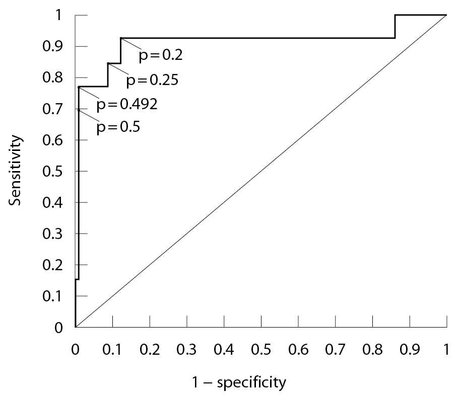 Основываясь на максимальной диагностической эффективности (точности) модели, значение порога активации было выбрано равным 0,492: если значение p, рассчитанное по вышеприведенной формуле, оказывается большим или равным 0,492, предполагается наступление ПР. Чувствительность модели составила 76,9%, специфичность – 99,1%, диагностическая эффективность – 96,9%, положительная предсказательная значимость модели – 90,9%, отрицательная предсказательная значимость – 97,4%.