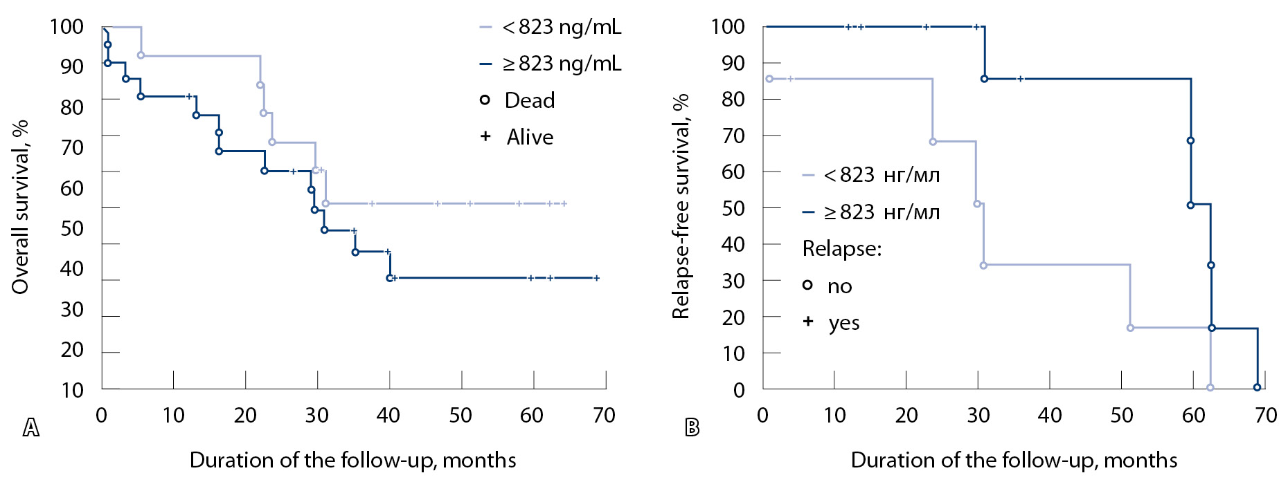 Что касается связи уровня ММП-9 в сыворотке крови с прогнозом больных РЖ, статистически значимых различий мы не обнаружили, но прослеживалась тенденция к улучшению показателей выживаемости при уровнях маркера ниже порогового (823 нг/мл). Показатели общей и безрецидивной 5-летней выживаемости в группе с низкой концентрацией маркера составили 58 и 18% (медиана 32 месяца) соответственно, а в группе с высокой концентрацией ММП-9 в крови общая выживаемость составила 38% (медиана 31 месяц), безрецидивная – 46% (медиана 60 месяцев) (рис. 3; p = 0,29 и p = 0,116 соответственно).