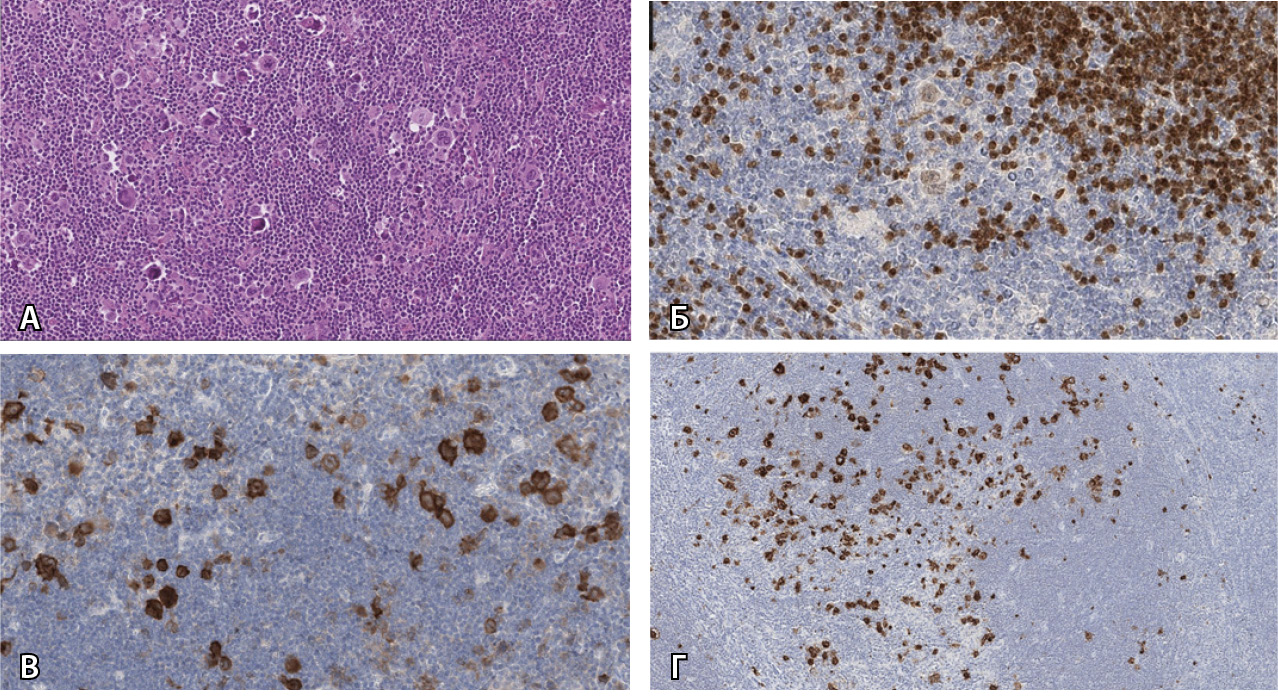 Рис. 2. Иммуногистохимическое исследование. Лимфатический узел с фиброзными септами, ограничивающими нодулярные структуры из лимфоцитов, немногочисленных гистиоцитов и эозинофильных лейкоцитов, а также разрозненных крупных клеток, сходных с клетками Березовского – Рид – Штернберга (БРШ): А – многочисленные клетки БРШ с двумя или более ядер, эозинофильными ядрышками и широкой цитоплазмой. Обнаруживаются также клетки Ходжкина, являющиеся подвидом клеток БРШ, содержащие одно ядро с крупным ядрышком. Гематоксилин и эозин, × 200; Б – две крупные опухолевые клетки в центре изображения проявляют слабое ядерное окрашивание РАХ5 при сильной ядерной экспрессии в фоновых малых В-лимфоцитах, × 400; В – выраженная мембранно-цитоплазматическая экспрессия клетками БРШ, в том числе и в комплексе Гольджи, × 400; Г – выраженная экспрессия опухолевыми клетками CD15, × 200; CD30 – позитивная (выраженная мембранная и очаговая цитоплазматическая экспрессия в крупных клетках); CD15 – позитивная (выраженная мембранная и очаговая цитоплазматическая экспрессия в крупных клетках); PAX5 – позитивная (слабовыраженная ядерная экспрессия в крупных клетках); MUM1 – позитивная (выраженная ядерная экспрессия в крупных клетках); CD3 – негативная; CD45 – негативная