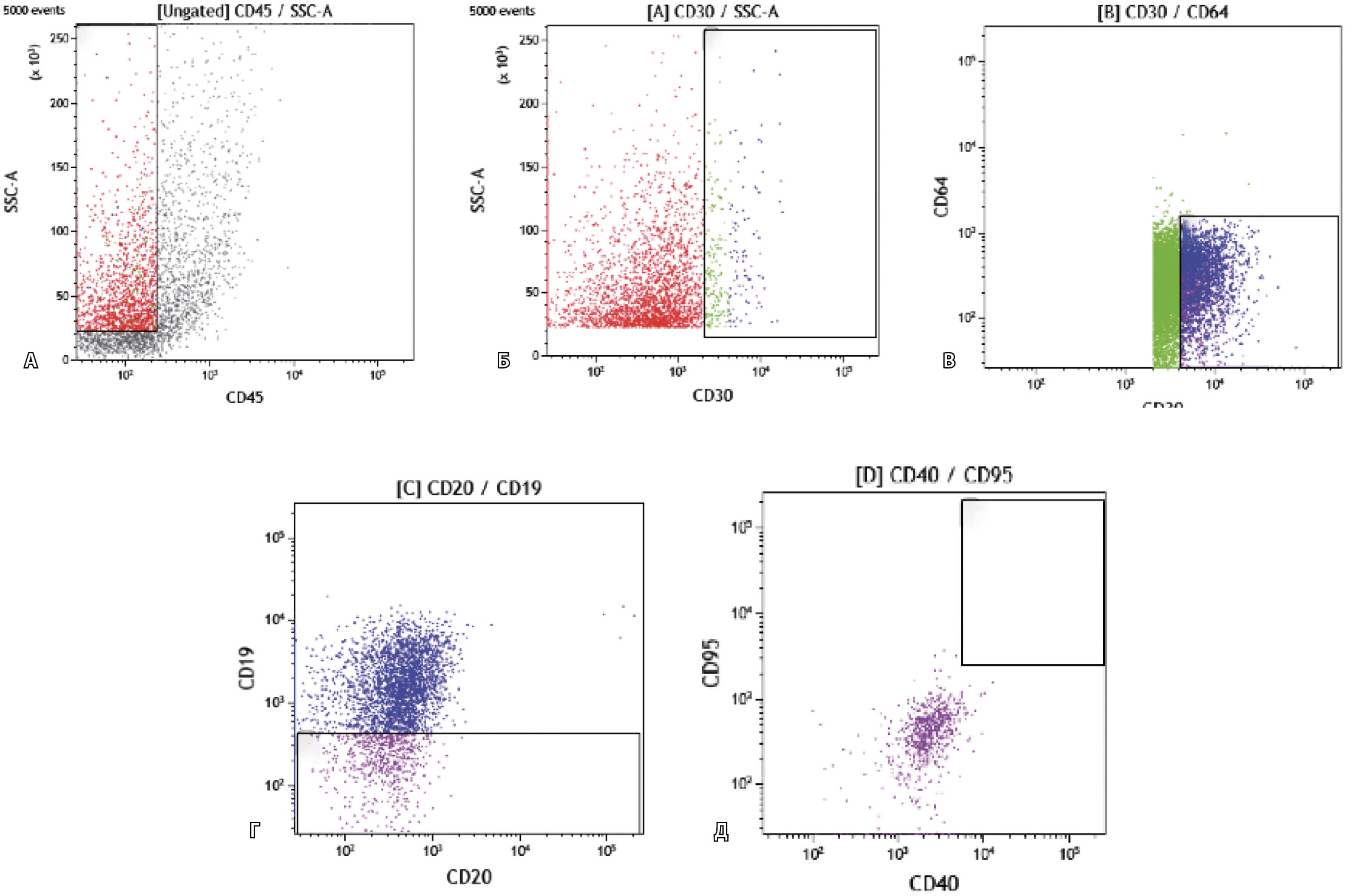 Рис. 3. Оценка иммунофенотипа клеток биоптата лимфатического узла пациента с забрюшинной внеорганной саркомой: А – выделение CD45-негативных клеток; Б – выделение области CD30+ клеток в пределах CD45-негативных клеток; В – ограничение области анализа популяций CD30+CD64-; Г – исключение из анализа В-клеток на основании экспрессии CD19- и CD20-антигенов; Д – оценка количества CD95+CD40+ клеток среди CD45-CD30+CD19-CD64- популяции, количество искомых клеток составило 0. Клеток с фенотипом Березовского – Рид – Штернберга не выявлено