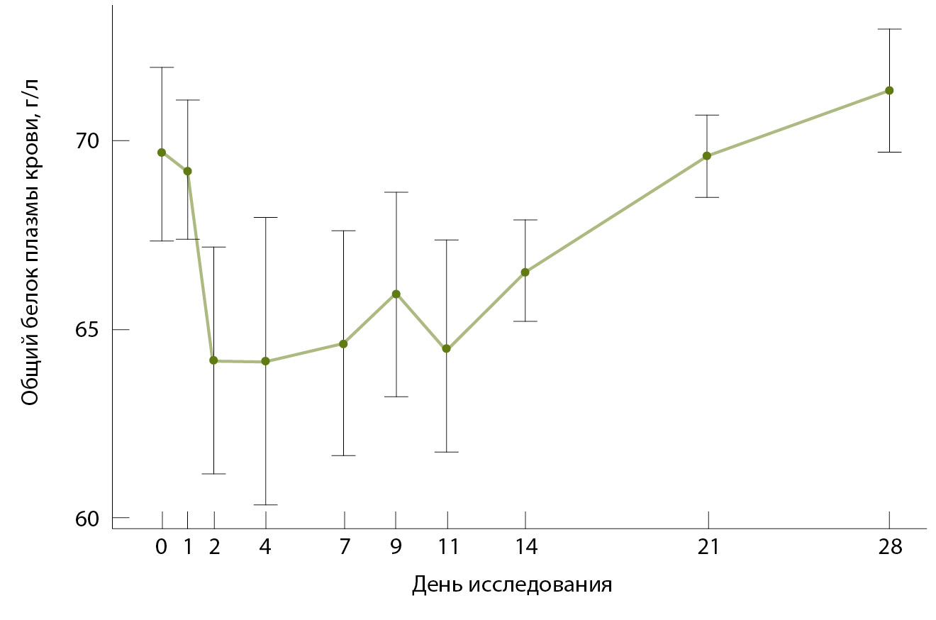 Результаты. Зарегистрирована удовлетворительная переносимость противоопухолевого препарата Инг-Рас для всех исследованных доз, включая максимальную – 1,8 мг/кг. Отмеченные отклонения значений жизненно важных и лабораторных показателей были клинически незначимы и не потребовали дополнительных терапевтических мероприятий. Статистически значимые изменения касались таких показателей, как концентрация общего белка (р = 0,00028), количества лейкоцитов (р = 0,007), лимфоцитов (р = 0,0008) и ряда других показателей крови, однако большинство изменений были в пределах физиологических нормальных значений. Такие жизненно важные показатели, как данные электрокардиографии и эхокардиографии, были стабильны на протяжении всего времени наблюдения (28 дней с момента введения препарата). Отмечены кратковременные подъемы температуры тела, незначительные боли в области послеоперационного рубца.