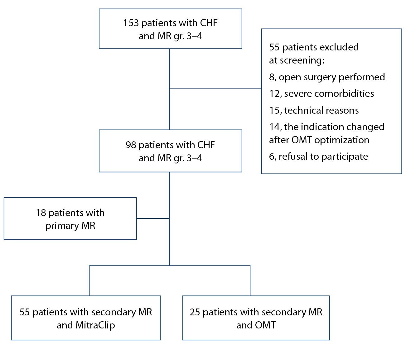 Изначально выполнен скрининг 153 пациентов, поступивших для обследования и лечения в ФГБУ «Национальный медицинский исследовательский центр кардиологии имени академика Е.И. Чазова» Минздрава России (ФГБУ «НМИЦК им. ак. Е.И. Чазова» Минздрава России). После отбора пациентов 73 из них была выполнена транскатетерная пластика МК с использованием устройства MitraClip. Оперативное вмешательство проводилось в условиях рентген-операционной под контролем чреспищеводной эхокардиографии (ЭхоКГ). Суть операции заключалась в том, чтобы максимально близко повторить методику наложения шва по типу «край-в-край», но с применением специальной клипсы, которая, при наложении на створки МК, создает «шов» с двойным отверстием [11]. У 18 пациентов система клипирования створок МК (MitraClip) была установлена по поводу первичной МР. Основную группу исследования составили 55 пациентов со вторичной МР и имплантированными системами клипирования. В группу сравнения вошли 25 пациентов со вторичной МР, которые по разным причинам (отказ от оперативного вмешательства, особенности клапанного аппарата) не подвергались хирургическому лечению МР и получали только ОМТ ХСН. Таким образом, проведен анализ наблюдения 80 пациентов со вторичной МР (рисунок).